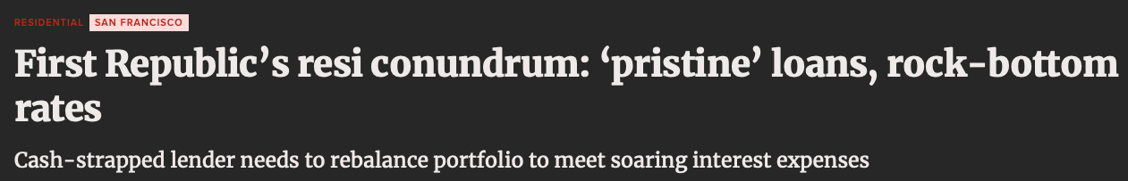 So for the sake of not repeating myself add this to your reading list this weekend! To show you how interconnected markets are, especially the scenario the U.S currently faces listen to this, the banks that issue CRE loans are smaller banks such as your SVBs, Pacific West Bank and FRBs, roughly 43% of the total loan book of these smaller banks were made up of CRE loans. Refinancing these loans in such a high-rate environment rings alarm bells, especially when these banks were issuing dirt-cheap CRE interest loans.