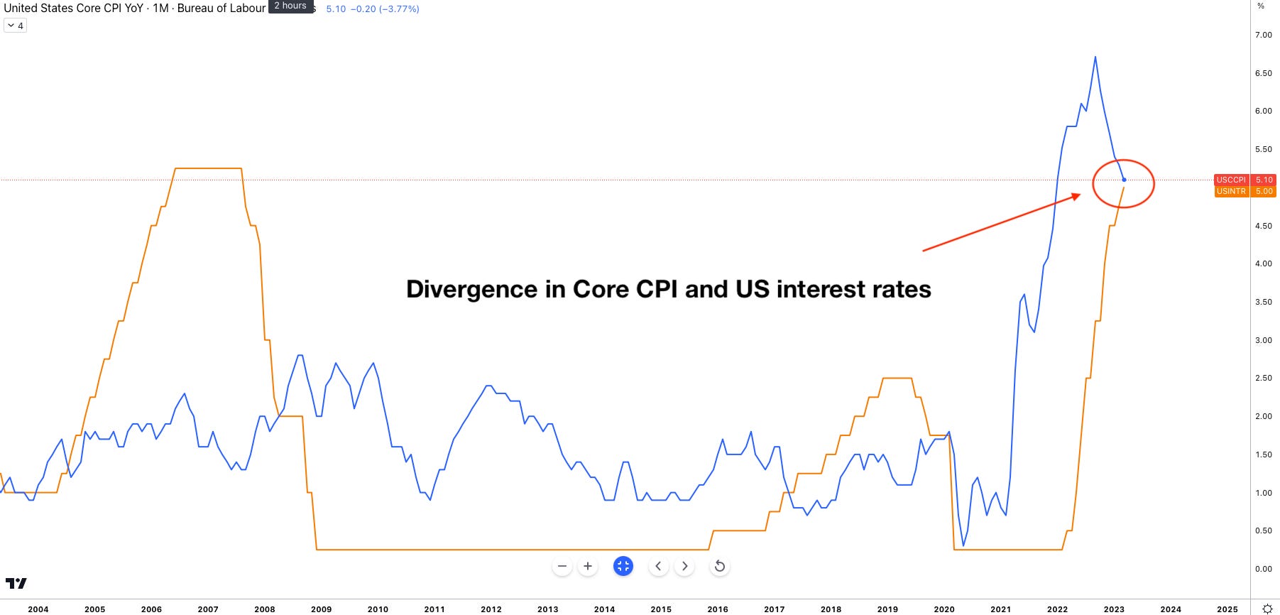 If there’s one solid reason, Jay Powell is in the right to pause here it’s this chart right here. History shows, when looking back at the GFC crisis of 2007 that the Fed have to hike interest rates above the level of core inflation, in order to successfully see inflation return to 2%. As we can see Core CPI is in a sharp decline, with many expectations calling for inflation to fall below the 5% region in the near term giving the Fed more time to observe the economy.