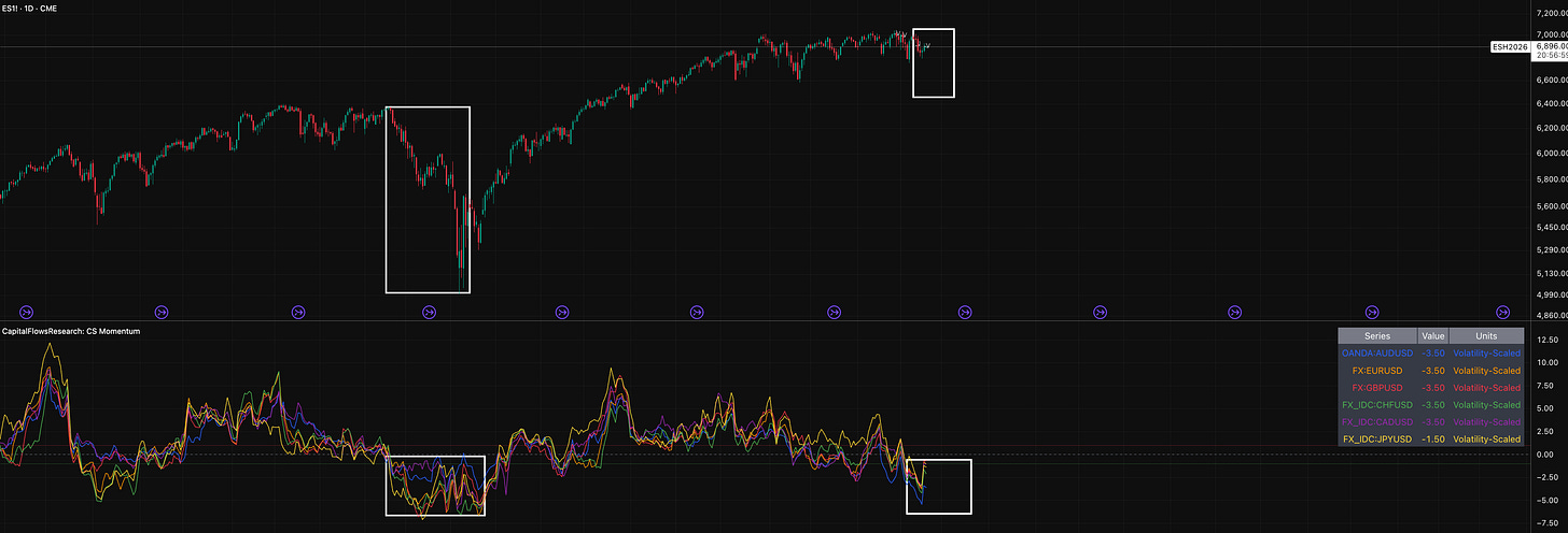 FX CS momentum is beginning to trade in NEGATIVE territory, just like we did at the beginning of April. I DO NOT think we will see a leg lower asd we did back then, but I DO think this will cause downside pressures in equities.