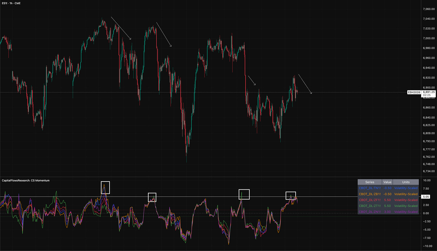 2) Bonds are outpeforming equities on an intraday basis, equities are struggling and making weak legs higher, not with any real momentum vs bonds. Just look at everytime we come to this extreme in CS momentum.