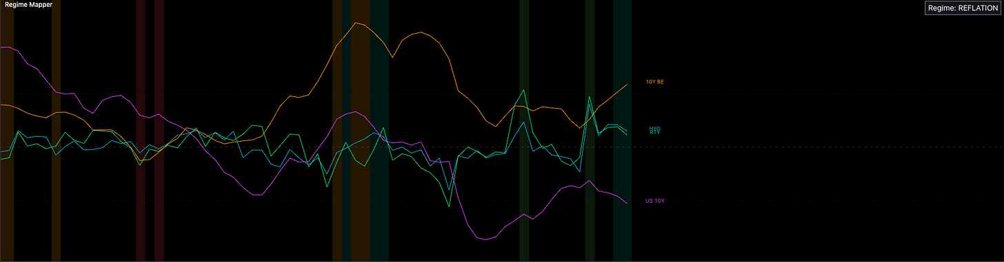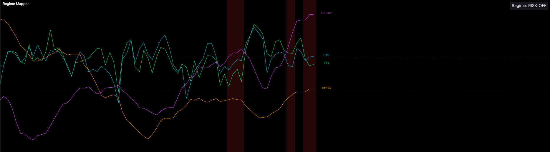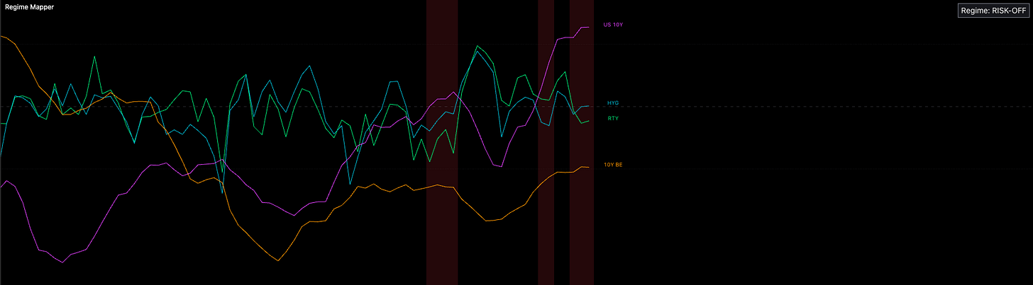 Also look at one of my regime models below, you can see how the 10y Z score has blown out higher and is now starting to act as a drag on equities, specifically the Russell. At the same time breakevens on a Z score basis are also ticking higher.