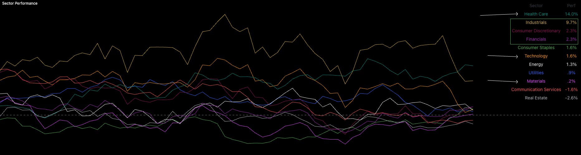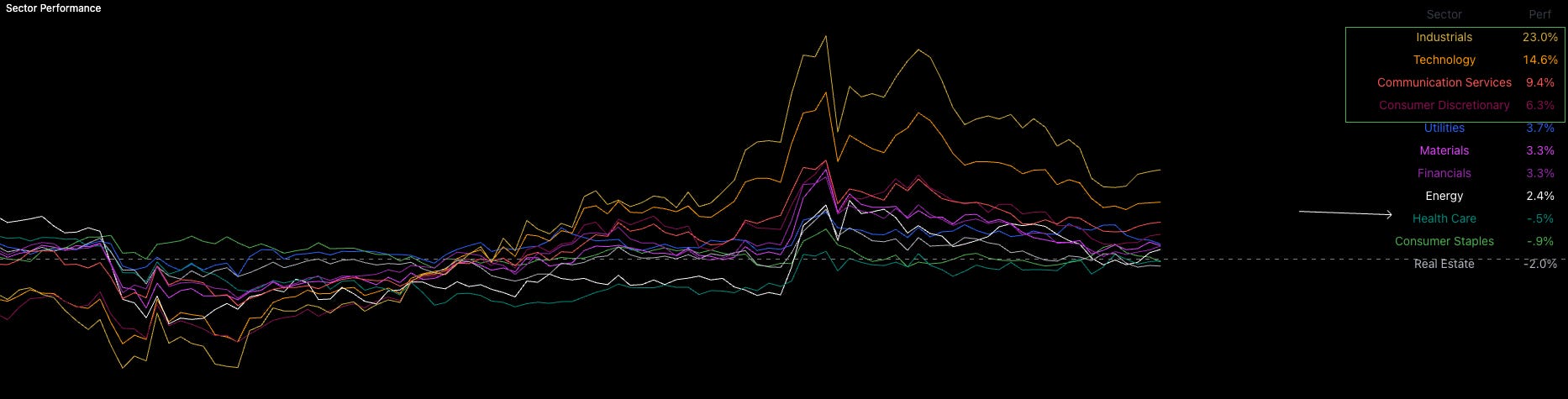 Looking at the last 3 months, healthcare has been leading sectors, while tech has slipped to the middle of the table after being a consistent outperformer for most of the year. Materials have also been sliding down the rankings. That tells me risk appetite is cooling at the margin, not collapsing.