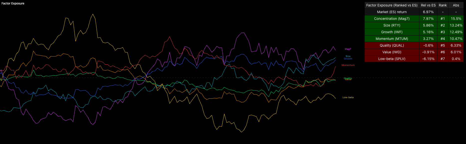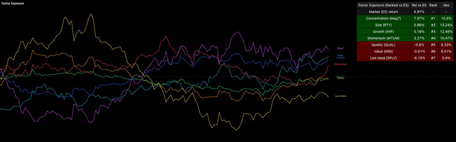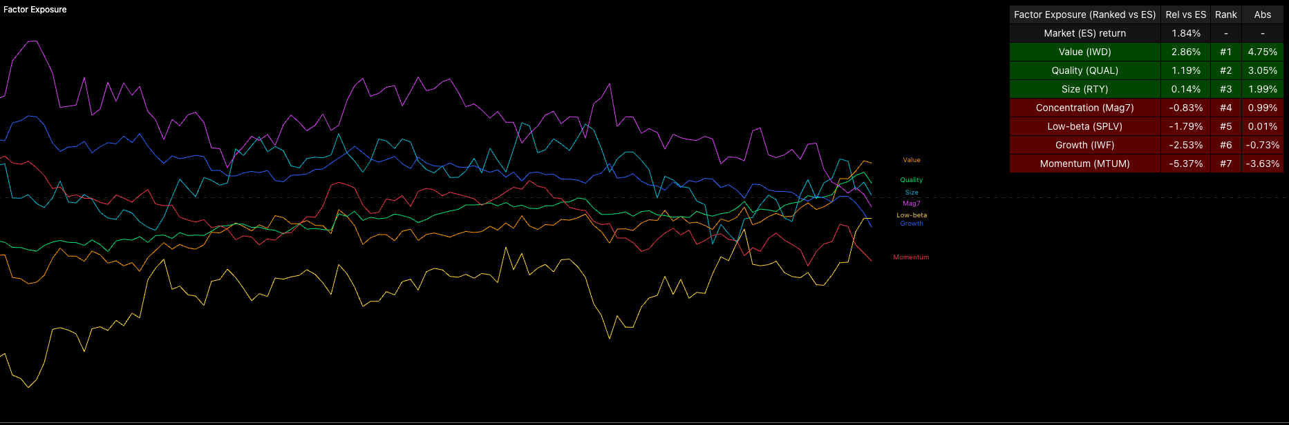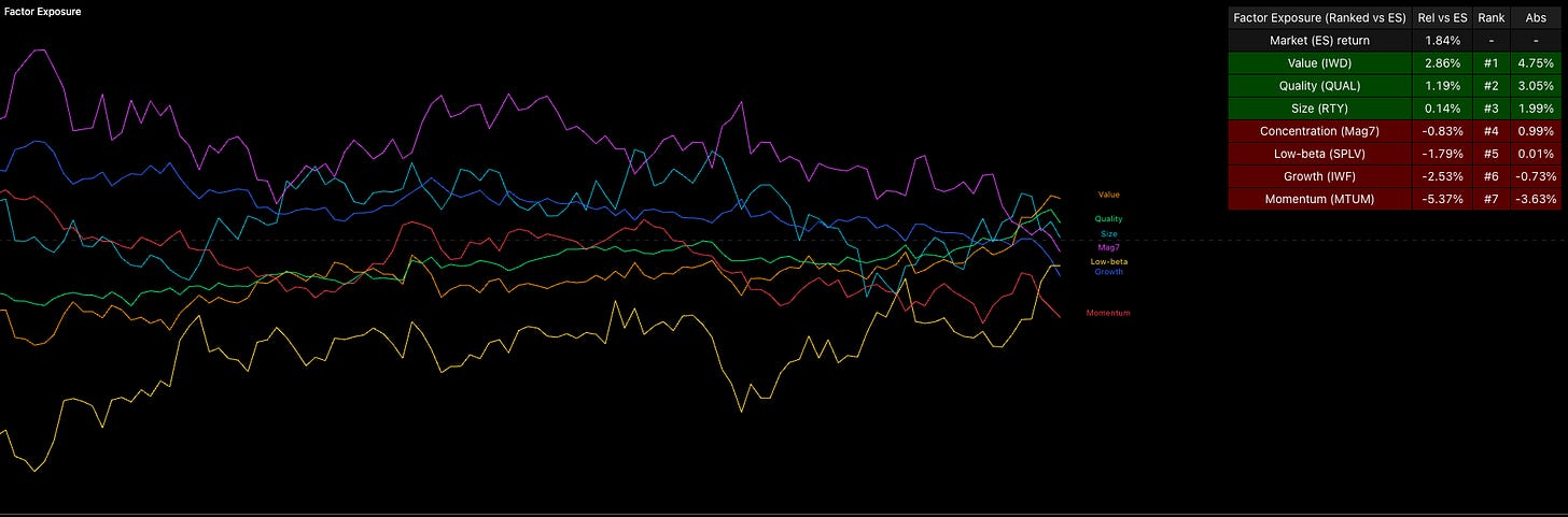 While we’re on the topic of orange signals, I’d put this next part in the same bucket as sector rotation. It’s showing early signs but not a full blown shift. That signal is factor exposure. Factor exposure matters a lot for portfolios because at the end of the day, it’s attribution analysis. Over the last 3 months, growth and momentum have become less important drivers of equity upside. Instead, value and quality have been persistent contributors.