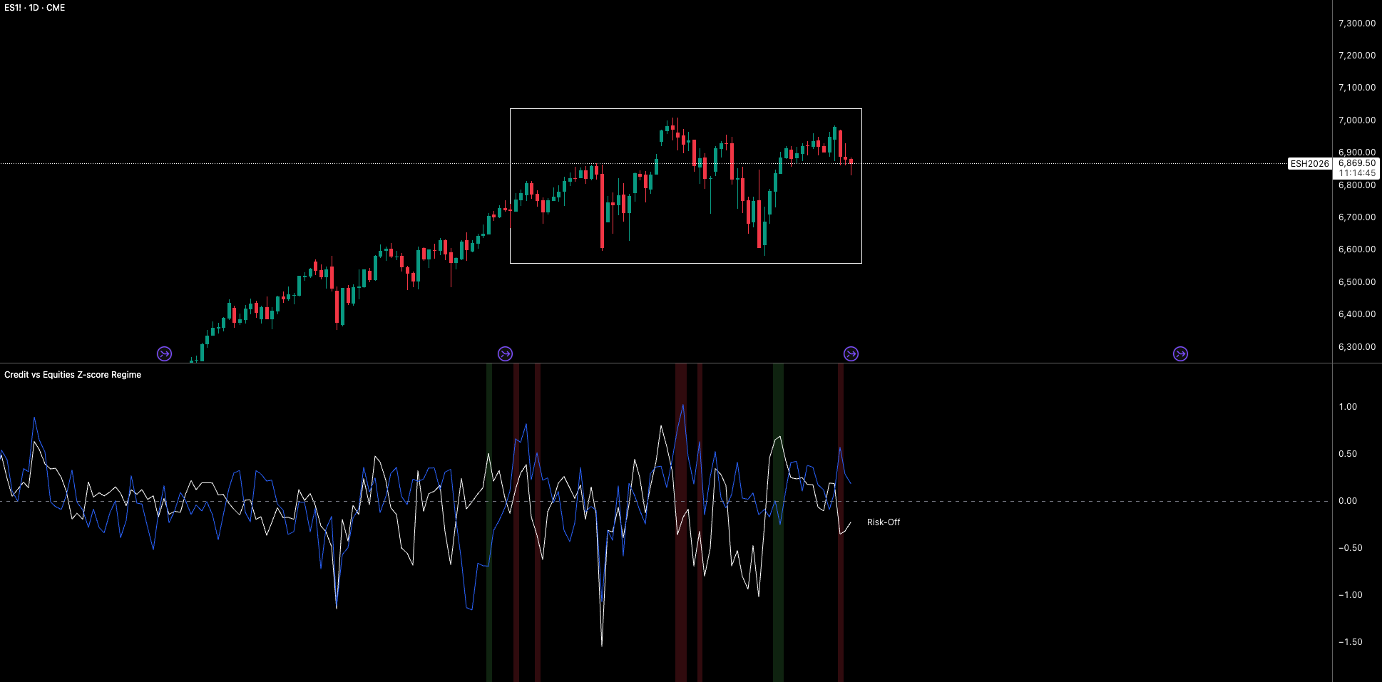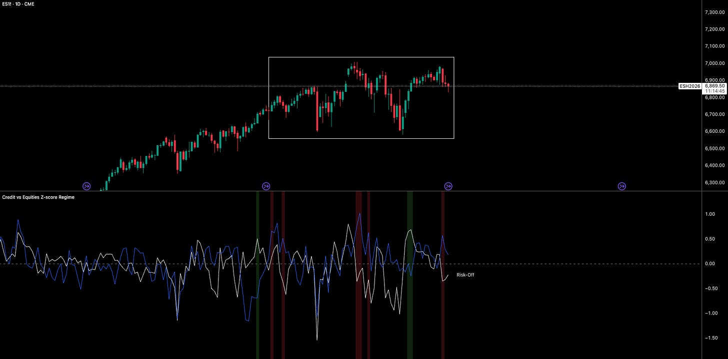 Really strong framing of the current market outlook. Even though we have cuts being pulled forward, the credit vs equities divergence explains why ES hasn't continued to rip. We are definitely seeing a mixed-signal regime as of right now.