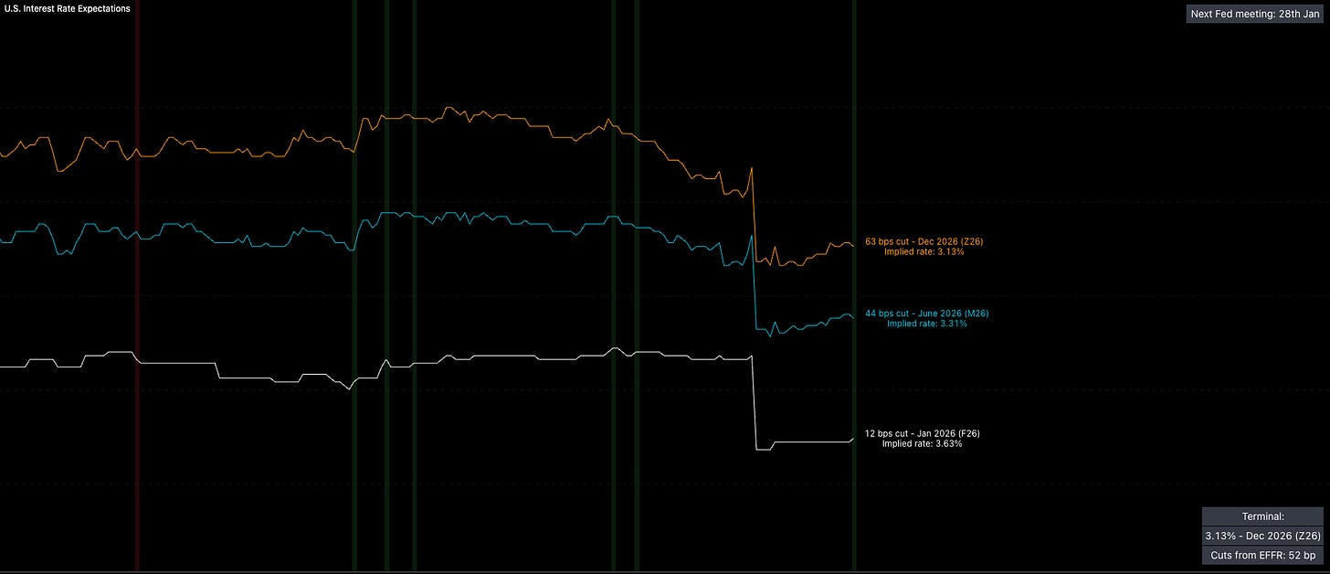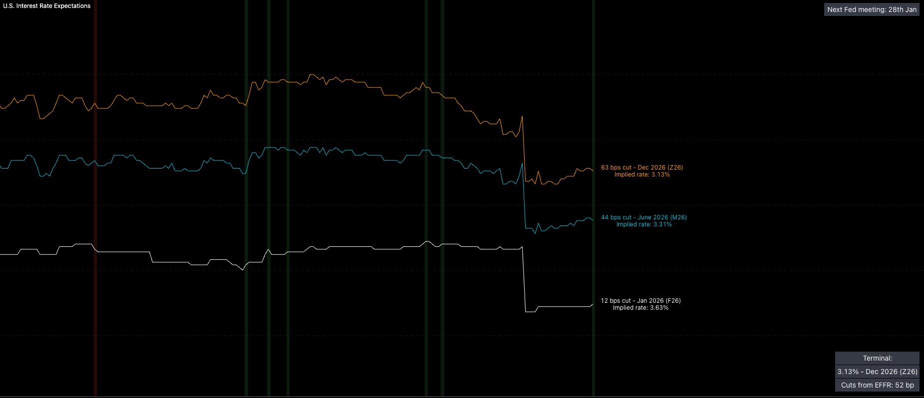 Let’s get into the setup in equities. First, I want to focus on the shifts in the curve for 2026. The key thing I’m watching is that the terminal rate is being pulled closer in time, moving from the H7 contract to Z6. As rates shift from further out contracts into nearer ones, the focus tightens around the 2026 contracts. You can see this clearly in the shaded green regions below. Cuts that were priced into December are being dragged forward into earlier contracts, specifically January-March.