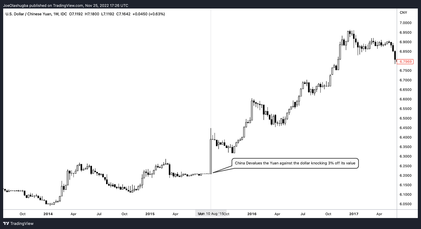 Devaluing a domestic currency reduces the purchasing power and strength of that currency, let’s say the Chinese Yuan in this example. What this does is make the devalued currency’s goods more attractive to the global world of trade as the value of China’s exports will cost less in your respective currency. So a nation’s exports become more competitive globally. It’s not all positives however, as you devalue your currency imports become increasingly expensive as well as debt servicing/repayments if the debt is denominated in a foreign currency like the dollar. So this strategy works great for net exporters of goods & services as supposed to importers.