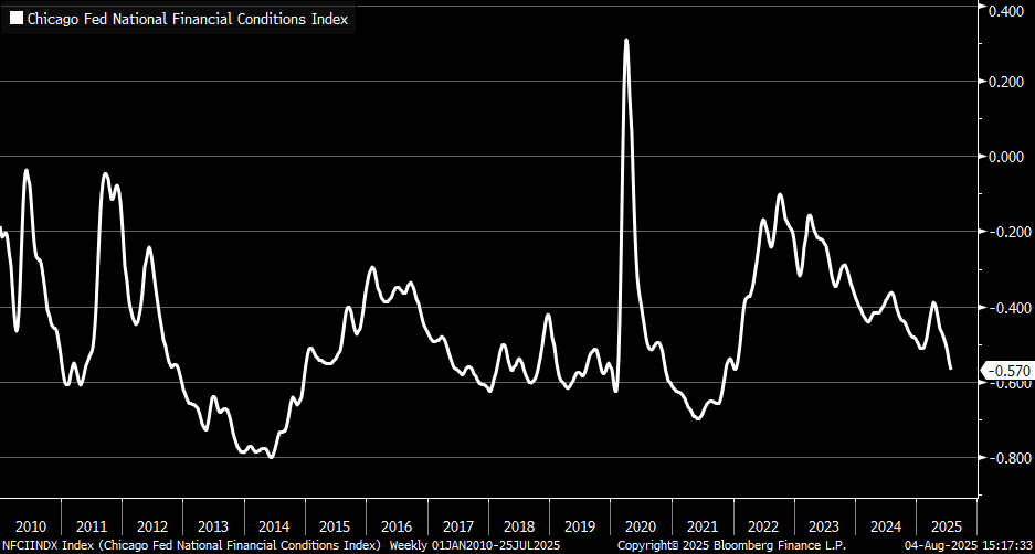 So is the labor market alone going to crush growth? No. That’s simply because the likelihood of us having a crazy downturn in the jobs market is low based on how resilient it has been with not enough structural change since then to cause that downturn (tariffs would’ve already done that imo). The last time the Chicago Fed's National Financial Conditions Index was this loose was November 2021. It’s simply too early to be pricing any more than 50bp into cuts for this year, if the Fed want to have hold of inflation (which they don’t).