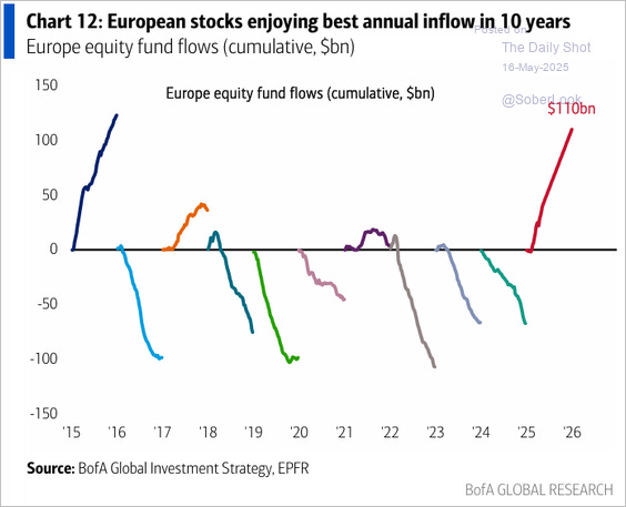 The reason I point out that the US-EU trade deal as a tail risk for European inflows is because of the tone of negotiators on both sides. The EU are demanding low tariffs (which Bessent has assured everyone isn’t realistic) and said they’re ready to fight back, while Bessent himself said that any country who wasn’t willing to negotiate in good faith would receive April 2nd tariff levels (extreme). Germany’s Merz will be hoping for a miracle after he called for an elimination for all tariffs between the US and EU.