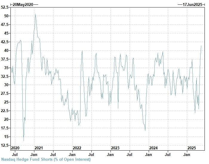 In the Nasdaq we’re seeing the same lack of confidence, hedge fund shorts of the index are increasing, we’re approaching the peak levels of shorts seen during the height of COVID. This is a great lesson, to not let your bias be changed by one market dynamic (bullish movement/one tariff announcement etc) but instead make the bias a file filled with confluences.