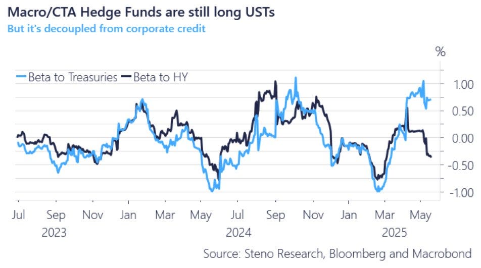 What took me by surprise is the fact that macro/CTA hedge funds are still long USTs, although the beta to HY and beta to Treasuries trend is decoupling. With many hedge funds remaining long bonds and short equities, it’s likely why we’re seeing many of the heavyweights making media rounds, pitching a revisit of the recent lows. There’s still plenty of rally chasing to come between now and July.