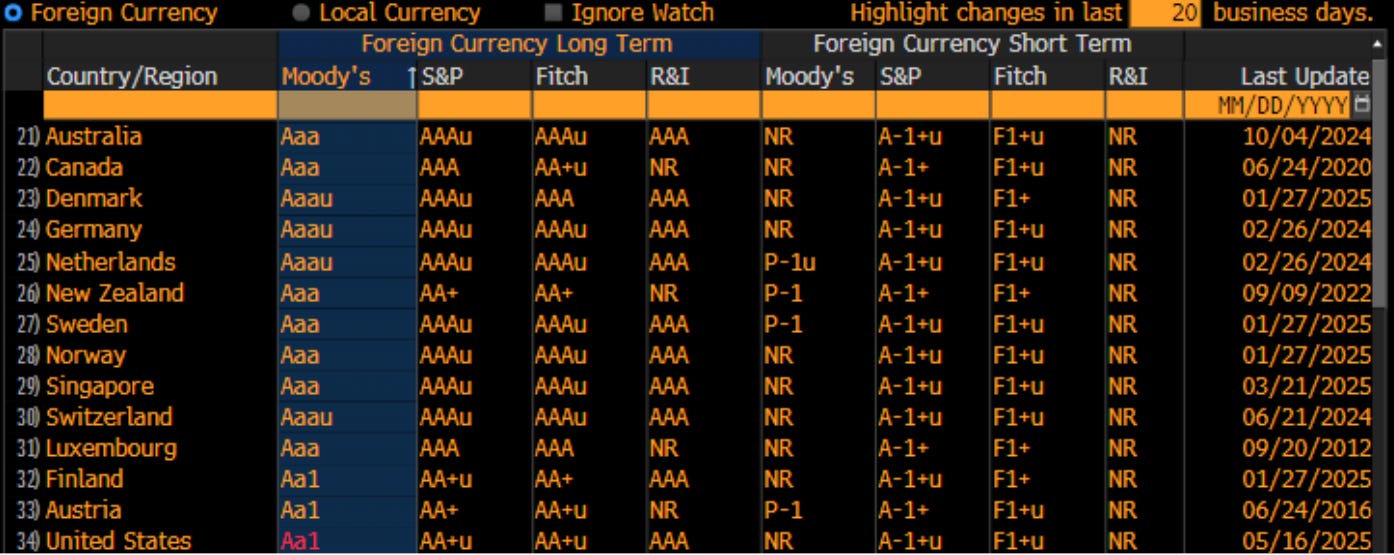 The table below shows where that leaves US credit rating vs RoW, it’s not pretty sitting at 34th.