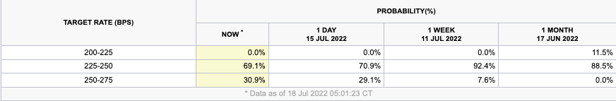 Prior to the June inflation print, expectations that the Fed would hike into the 225-250bps range were >90%, after we got the reading notice how expectations have pivoted to now ruling in a 100bps hike from the Fed which was unlikely with <12% probability just a month ago.