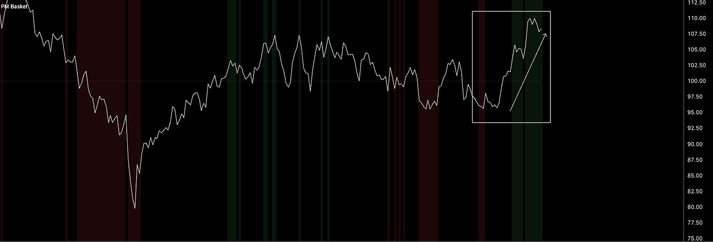 This also explains why industrials can rally even when backward looking data still looks ugly. Moving from very bad to less bad is often enough to drive meaningful price action in cyclical sectors.
