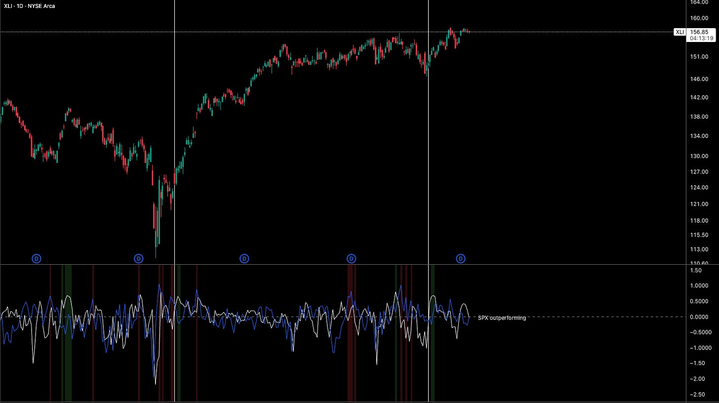Historically, recessions don’t begin with industrials making higher highs. They begin when industrials underperform defensives and earnings expectations collapse. If capital goods, transports, and machinery are getting bid, the economy is expanding, simple.