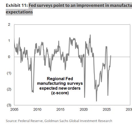 Another chart worth focusing on is the z score of expected new orders from regional Federal Reserve manufacturing surveys. In plain English, it shows directional intent inside the industrial economy, what manufacturers expect demand to look like going forward, not what it looked like last quarter. That distinction matters because equities trade expectations.