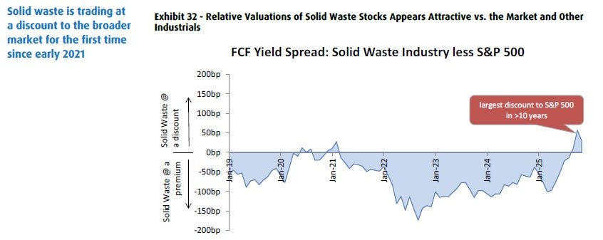 Now let’s talk valuation. The free cash flow yield spread of solid waste companies versus the S&P 500 is extremely important. The sector is trading at its largest valuation discount to the index in more than a decade. Investors are being paid significantly more in free cash flow to own a core industrial services subsector than to own the market. That’s been very rare outside of major stress or mispricing regimes.