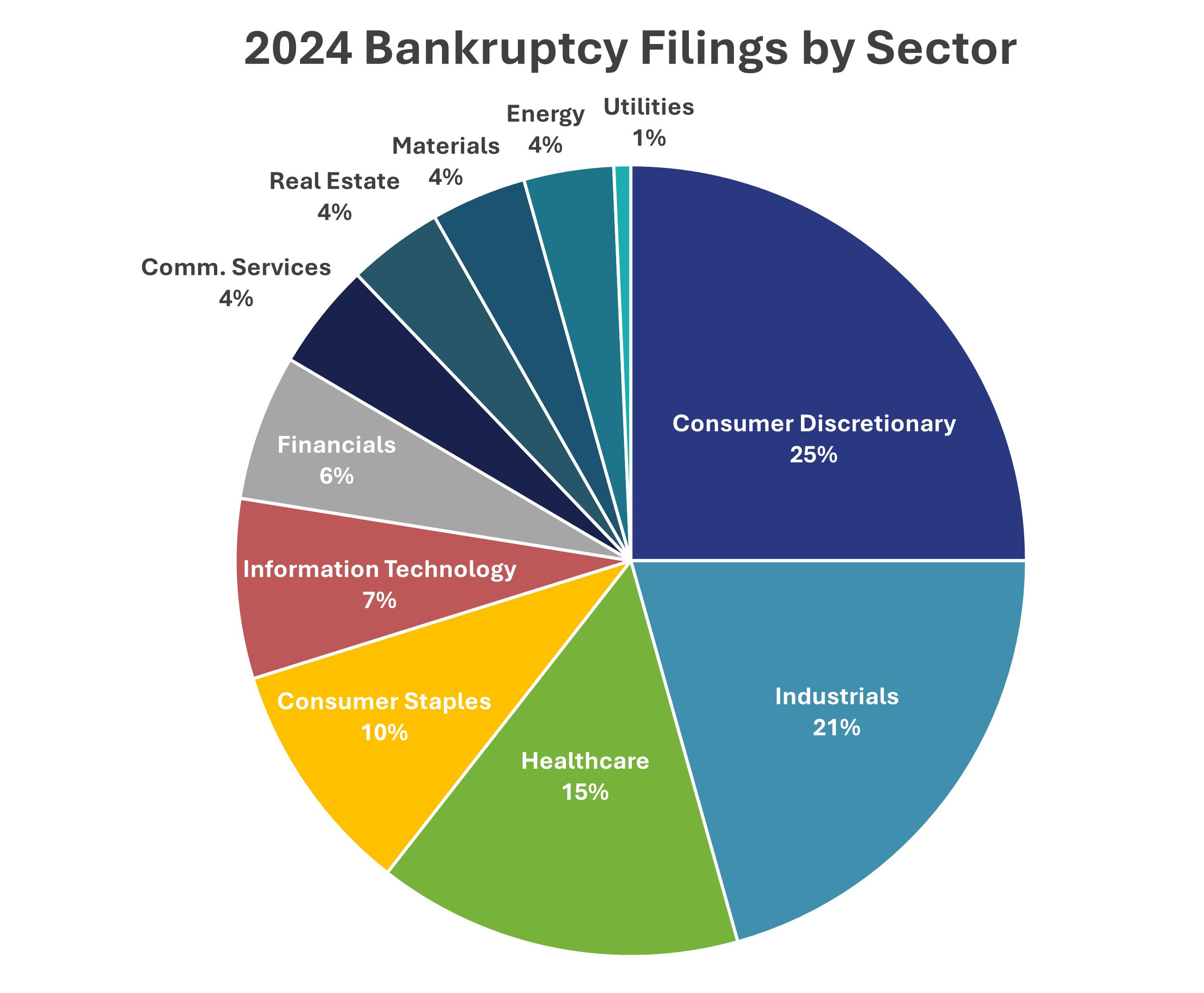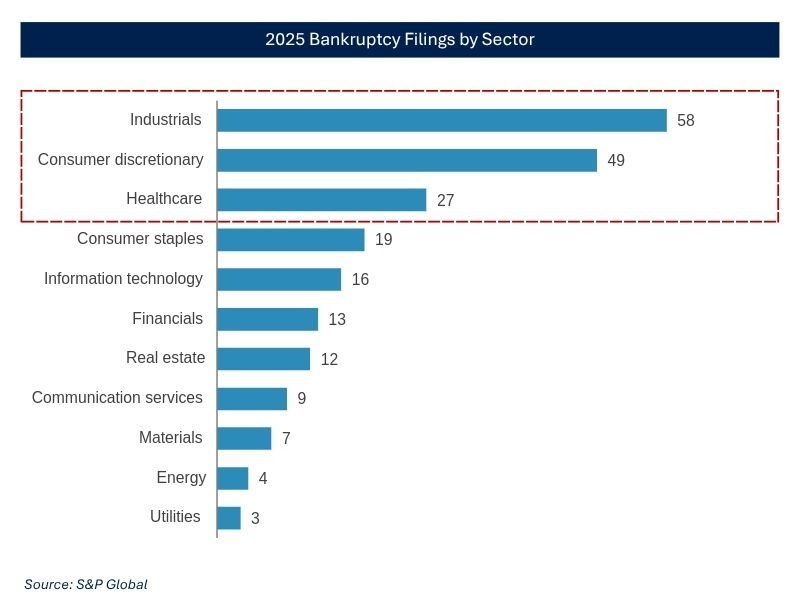 The sector breakdown reinforces this. Consumer discretionary, healthcare, and industrials dominate filings because these sectors carry operating leverage and debt structures that are most sensitive to rate shocks. As rates stabilise and financial conditions stop tightening, incremental stress slows and markets shift from fearing defaults to pricing survivorship and operating leverage.