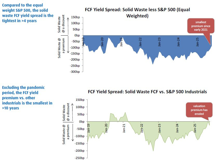 Against an equal weighted S&P 500, the free cash flow premium in solid waste has compressed to its tightest level in more than 4 years. Against other industrials, the premium has eroded to the smallest level in over a decade once you exclude the pandemic distortion. In other words, the sector is no longer being paid a meaningful quality premium for stability. It’s being priced much closer to the average stock in the market and to its own peers.