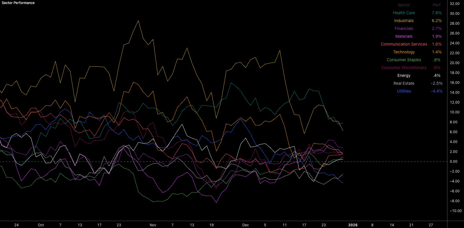 Sector leadership is critical to watch, but there isn’t just one correct mix that supports upside in equities. We’ve already seen that play out. From June to September, industrials, tech, and energy led. By year end, it was healthcare, tech, and industrials. Sector performance matters a lot, but you don’t want to fall into the trap of seeing healthcare leadership and immediately assuming the market is positioning defensively for an equity downturn. That mindset will make you miss setups and, worse, react for the wrong reason. Strong healthcare fundamentals don’t automatically equal defensive positioning.