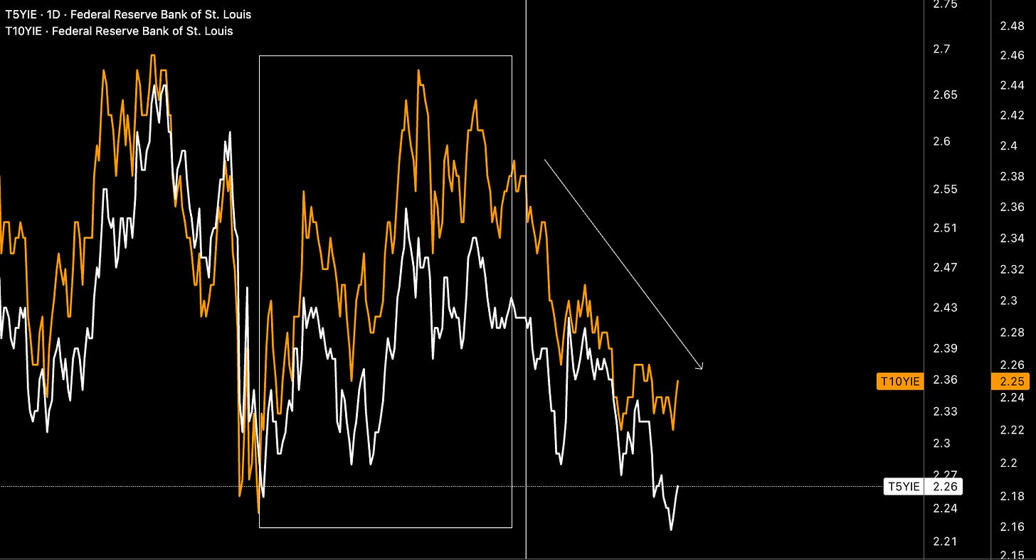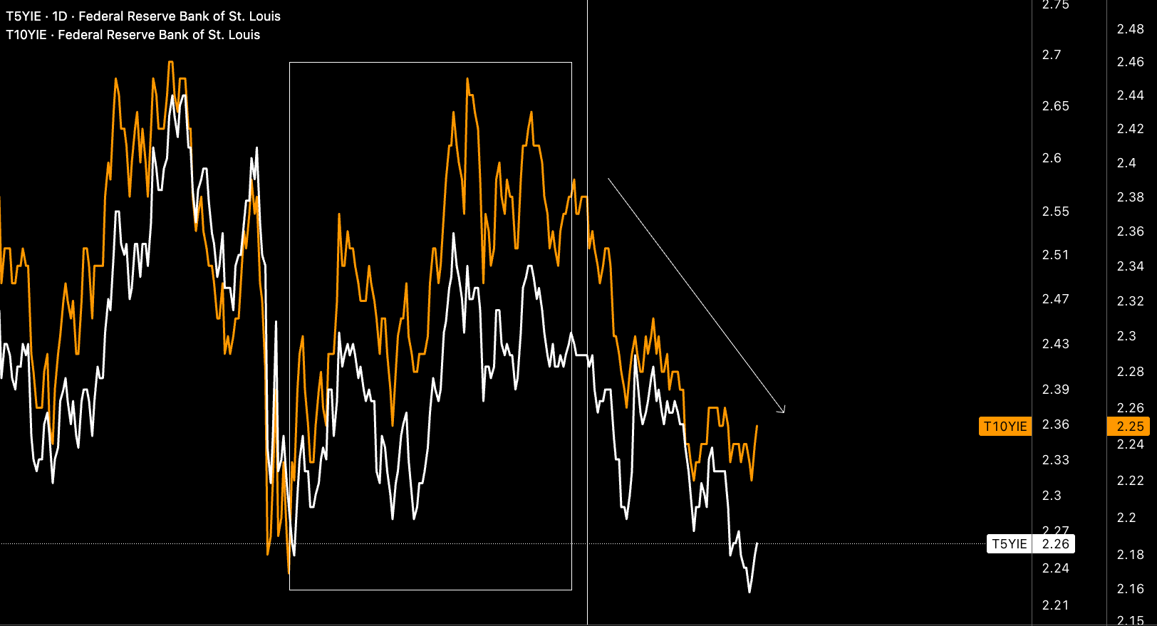 Markets are currently pricing lower inflation swaps while asset performance still reflects an environment accustomed to higher inflation and strong nominal growth. That mismatch is the source of current uncertainty.