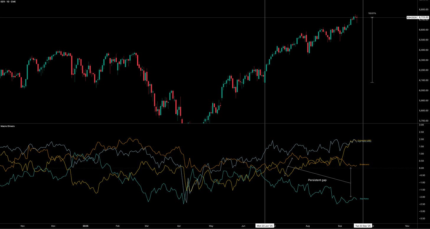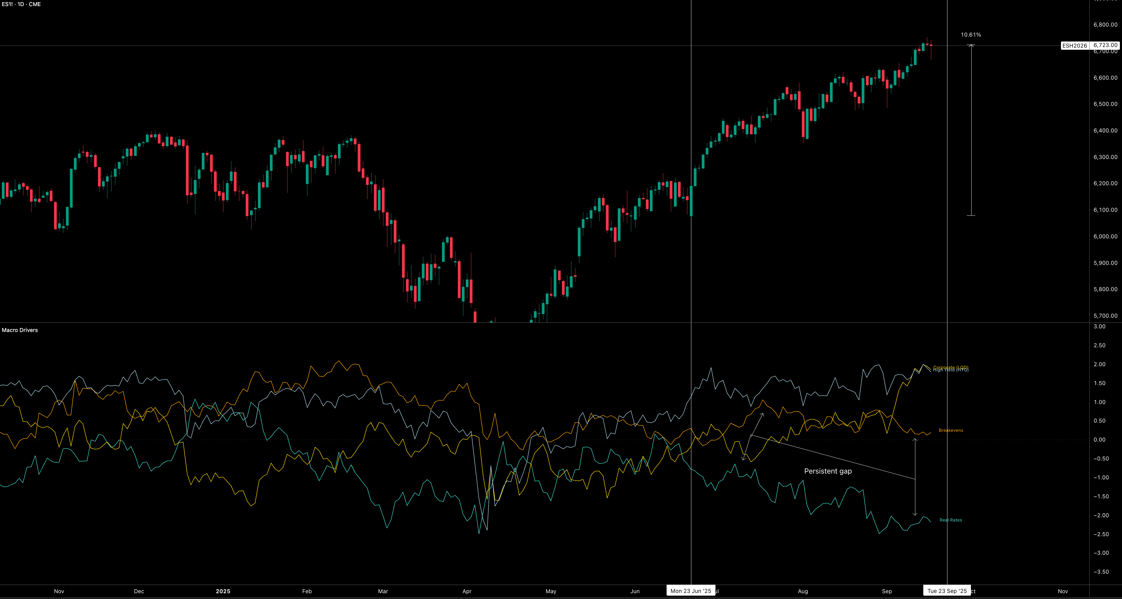 Real rates have pushed higher while breakevens have compressed with speed. This combination is important. During the June to September equity rally, the persistent gap between low real rates and higher breakevens created a supportive environment for risk assets. Even when breakevens dipped, real rates were accommodative enough to sustain upside.