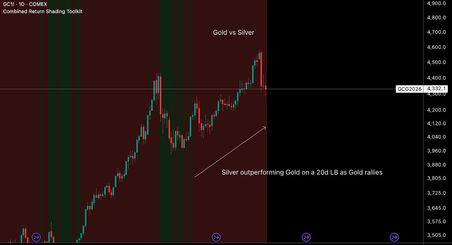 One divergence worth flagging is in metals. Silver has outperformed gold on a 20 day lookback even as gold continues to make new all time highs. This pattern usually aligns with improving growth, reflation, and risk on regimes.