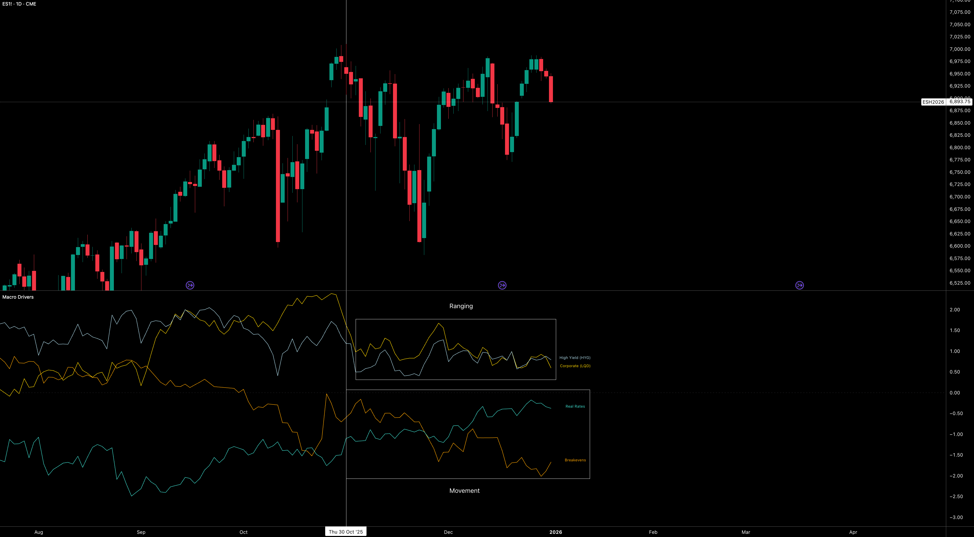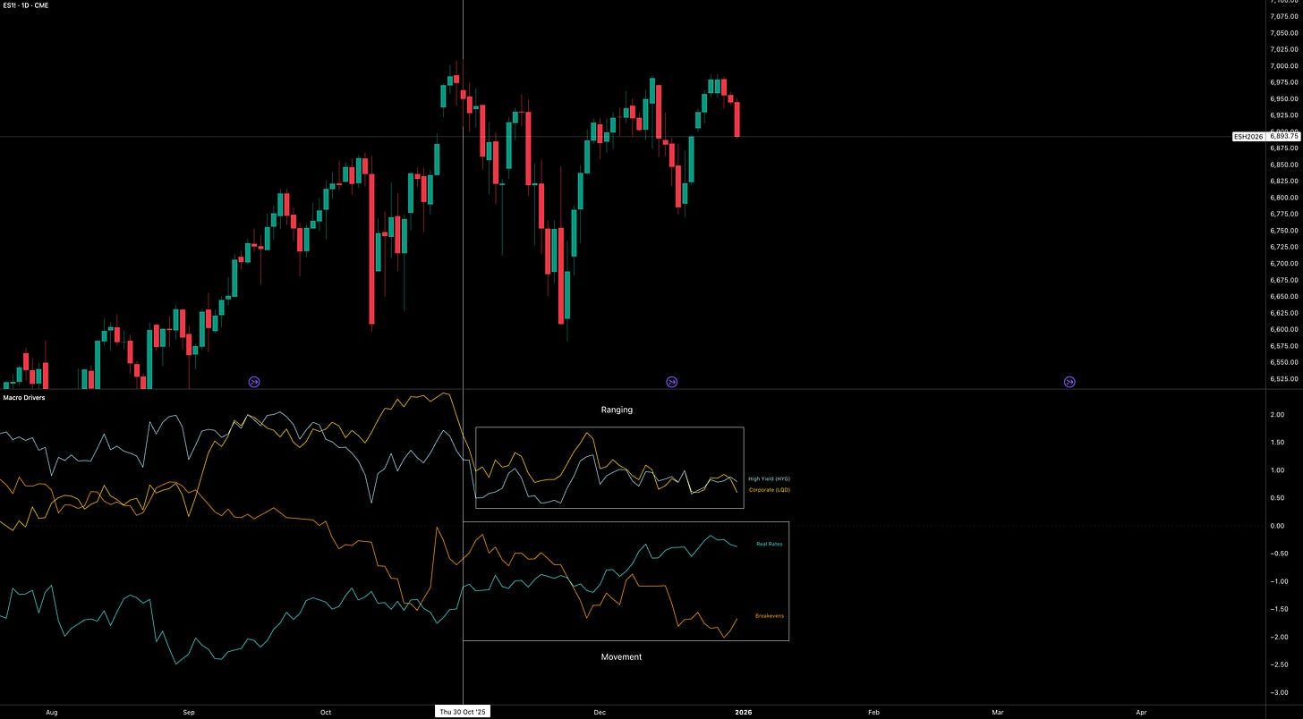 That buffer no longer exists. Marginal increases in real rates or further declines in breakevens now produce disproportionately larger equity reactions. However, recent real rate moves have not yet broken decisively higher. They remain sensitive to Fed expectations and incoming growth data, which keeps the regime unstable rather than clearly restrictive.