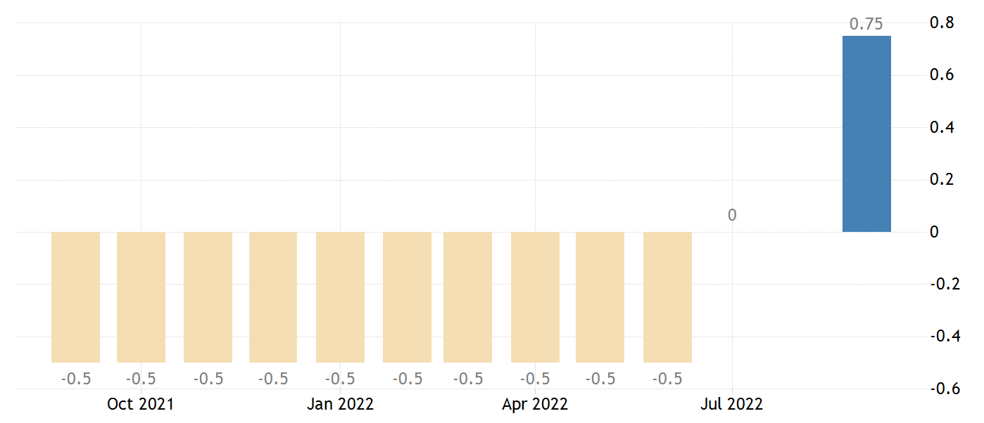 The ECB hiked rates a substantial 75bps taking their deposit interest rate to 0.75%.
