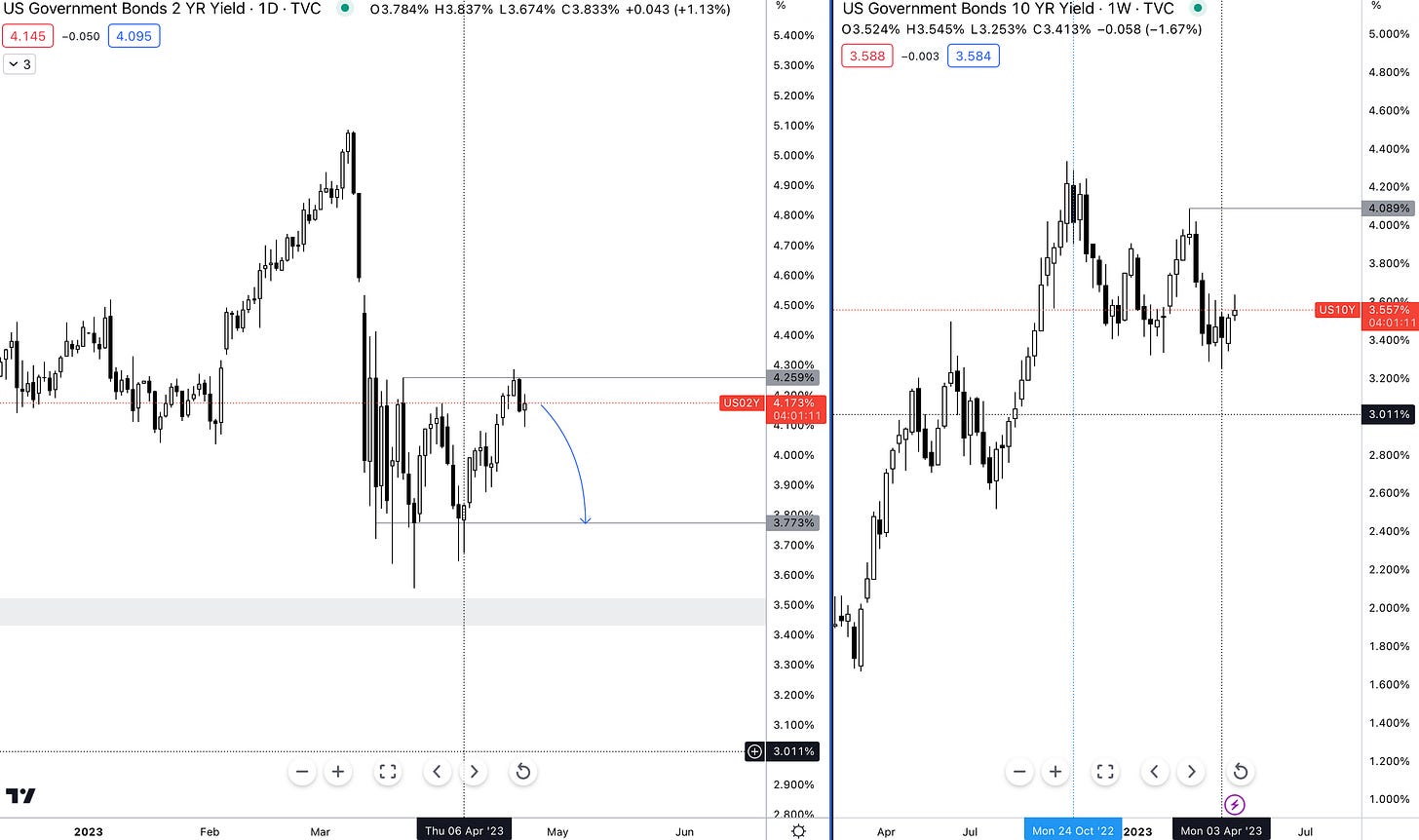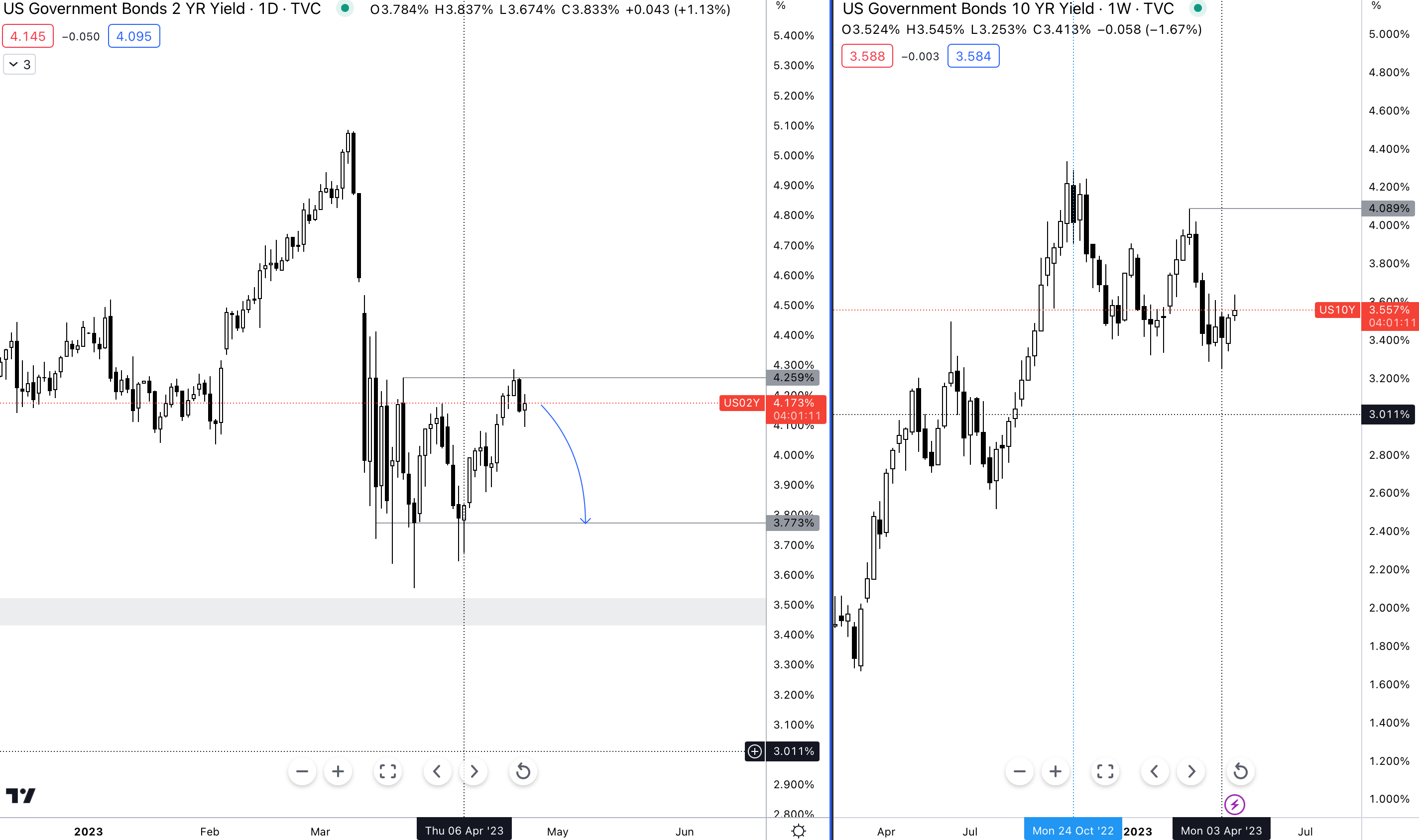 As a result, I would expect bond yields to reflect the sentiment and also move lower with the 2-year falling towards the ambitious 3.773% target and the 10y to bring the dollar lower in the near -3 month term. Once again, strong opinions, weekly held!