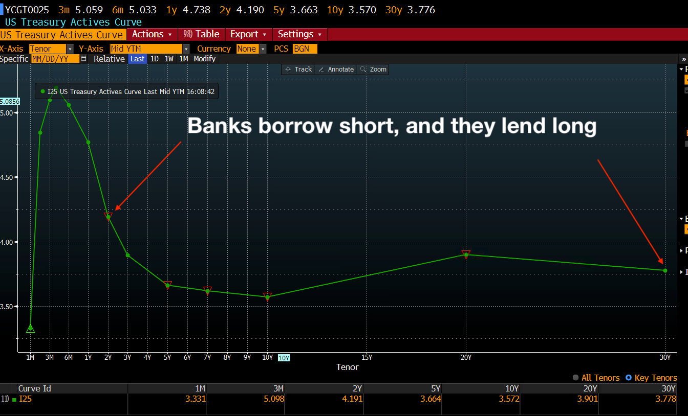 It’s a simple transaction, bank stocks perform well with a steep yield curve, meaning the rate of borrowing increases over time, so the 30Y rate would be higher than the 5Y rate and so forth. Currently, we have an inverted curve, the higher the cash rate and short-term borrowing rate, the more difficulty a bank has extending credit since their framework for borrowing relies on positive net interest margins, which in this environment is no longer a thing.