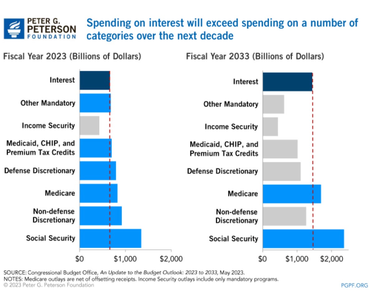 It’s expected that the U.S government’s payment on their interest bill for the fiscal year 2023 will total $633b, ramping up to $1.4tr in 2033. Their annual budget is $6.4tr, by 2033 the interest payments on U.S debt would be 21% of their budget, on the lower end!
