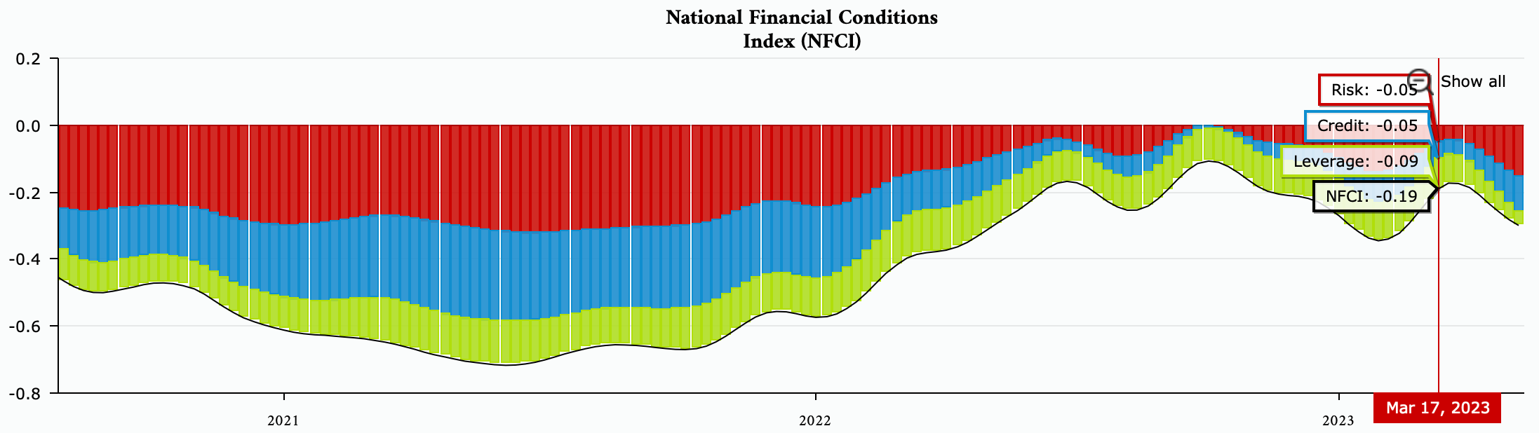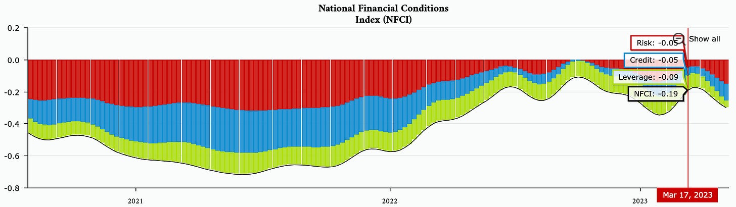 The financial conditions index below shows how the banking frenzy forced conditions to loosen ever so slightly due to the immediate accommodative actions taken by the Fed, but overall the index does show the path in tightening the Fed has guided markets too.
