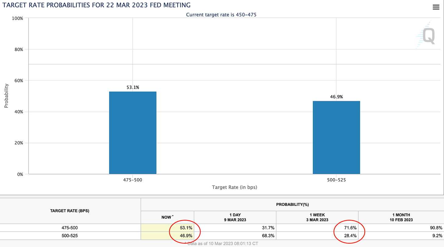 Just 1 week ago, markets had put a 71% probability that the Fed would hike into the target range of 475-500bps meaning a smaller 25bps hike, fast forward to today, and markets have it at an even stalemate. Compare that with the data from the 9th of March where the probability of the federal funds rate reaching the 500-525 range was close to 70! It’s clear to see that the non-farm payroll data we just saw shifted this possibility back a notch.