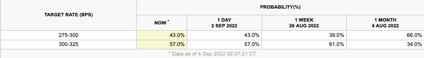 Unsurprisingly, we saw the unemployment rate tick higher shown in figure 1 to 3.7%. As a result of the increase in interest rates, we’ve seen massive layoffs across the U.S tech sector; names such as Paypal, Stripe & Robinhood. As it stands the federal funds rate is 2.5% and from figure 3 below we can see the expectations for the upcoming rate decision are tilted towards either a 50bps or 75bps hike.