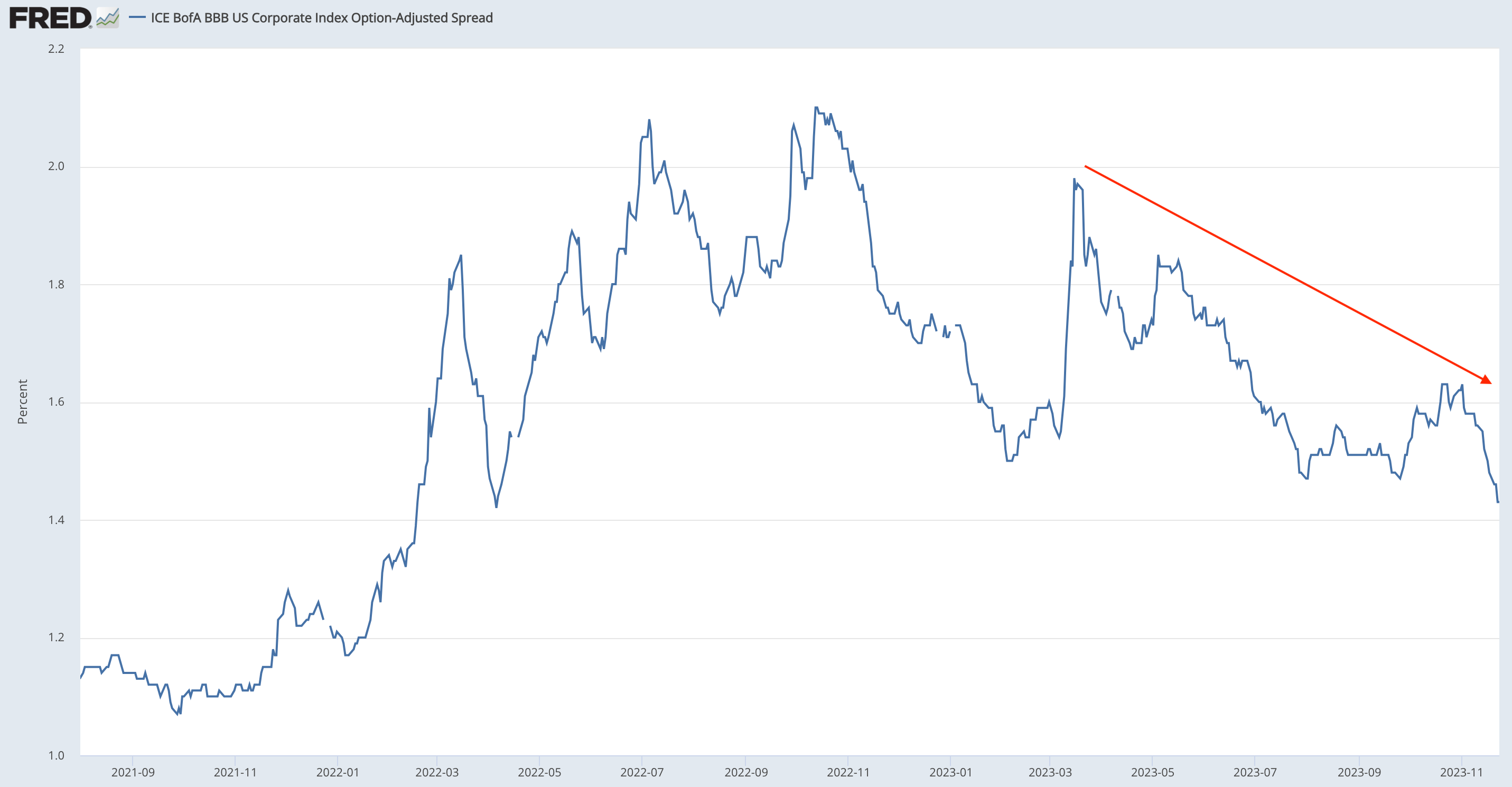 As mentioned, one way of observing credit within the US is the NFCI, but if you want to take it a step further you can analyse corporate credit spreads.