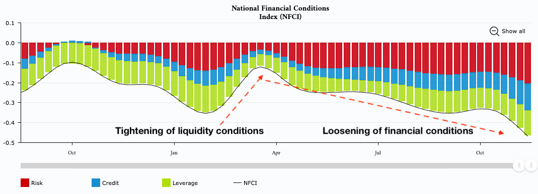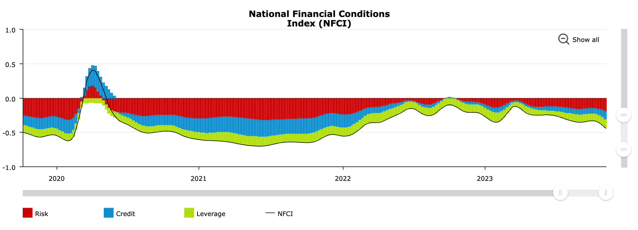 This index provides an overview of financial conditions in the U.S, taking a weekly snapshot of financial conditions across money markets, debt and equity markets as well as shadow banks. When the index values are above 0.0 this means financial conditions are tight, and as a result, liquidity conditions are drying up across markets. The opposite is true when the index is below zero, and moving lower, this represents a loosening in financial conditions.