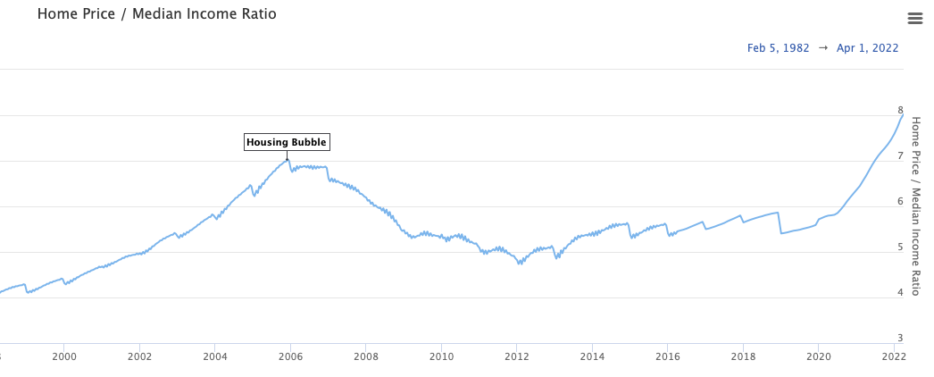 Since the GFC, real interest rates have been below 0% so borrowing/access to credit was fairly easy to get which feeds into the graph above where we can see house prices accelerate. Particularly 2019-2020 (Covid-19) where cash was being printed, rates were at 0% the house price/median income really took off aggressively and hasn’t slowed down.