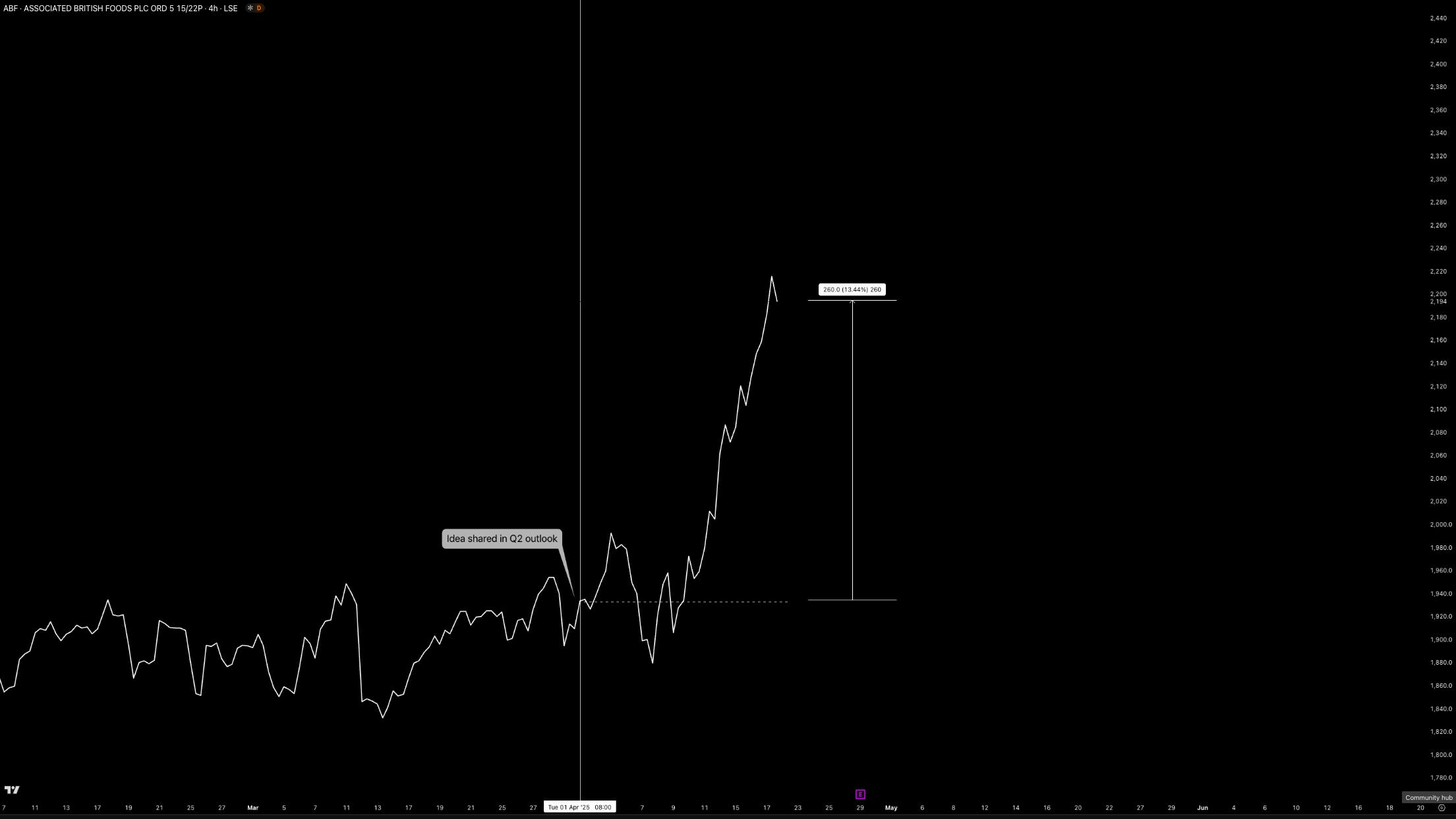 In my Q2 outlook report, I gave our first equity idea on Associated British Foods (ABF) and that trade is currently running +13.4%. The equity has nearly outperformed my price target for this quarter and we’re not even one month into Q2. I’m not personally here to catch every inch of every move and I’d recommend closing out some profits at these levels, which are sitting at a total of +13.4% for anyone who managed to get into the position when it was recommended. I will tag the report below and the current ABF chart.