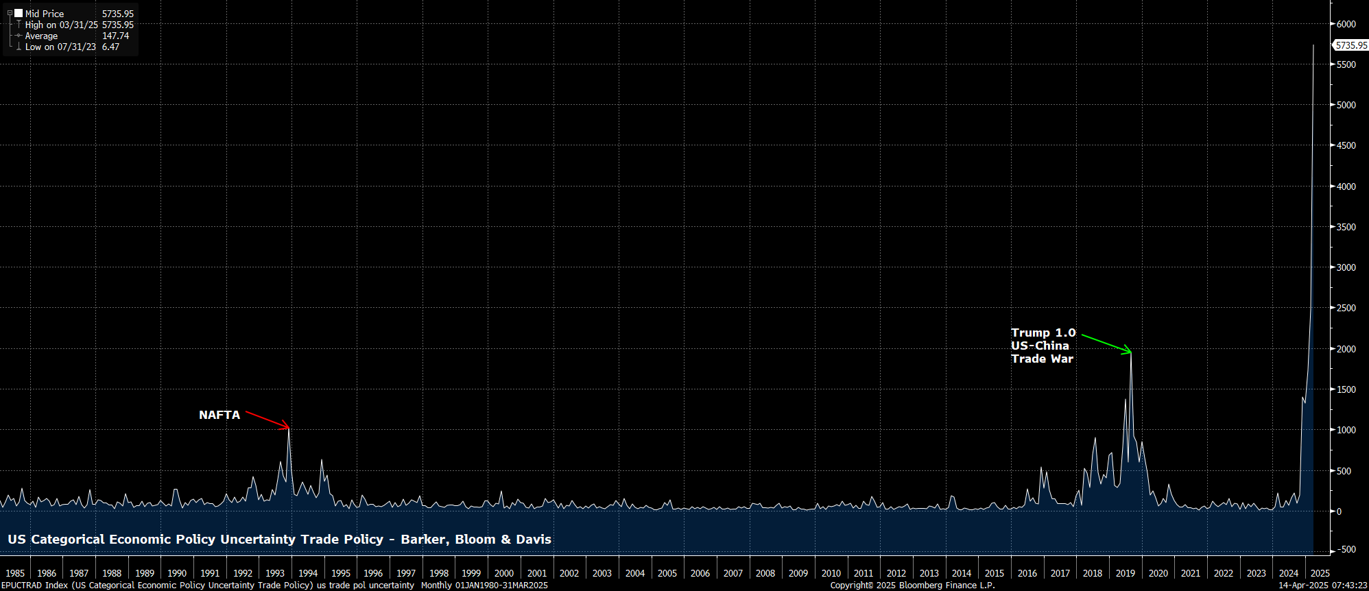 I know we are in a market right now which can be reversed at any given point by one man and one decision, really unprecedented times. However, I also know that Trump wants to follow through with his plans to “make America great again” and reshore industries meaning the chance of that one man making that one decision to reverse all markets is pretty low. That being said, I think there’s still a lot of pain to be felt in markets, particularly US equities. US trade uncertainty alone is at levels not seen in at least the last three decades. I think there is lower prices to come in the S&P500.