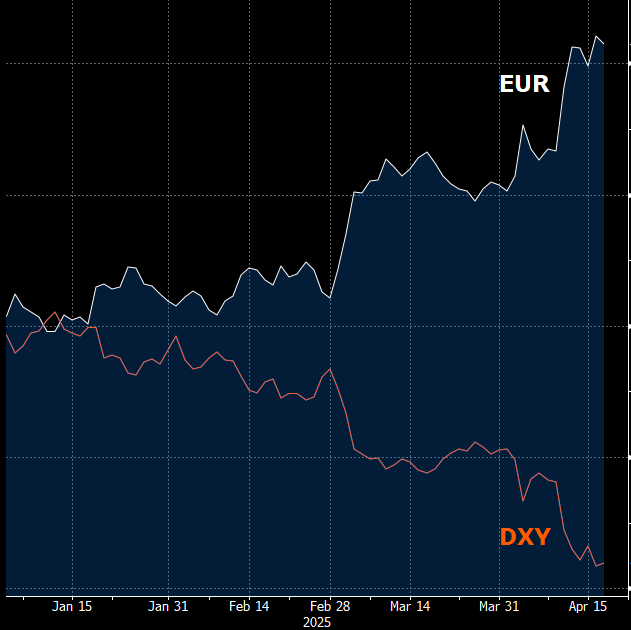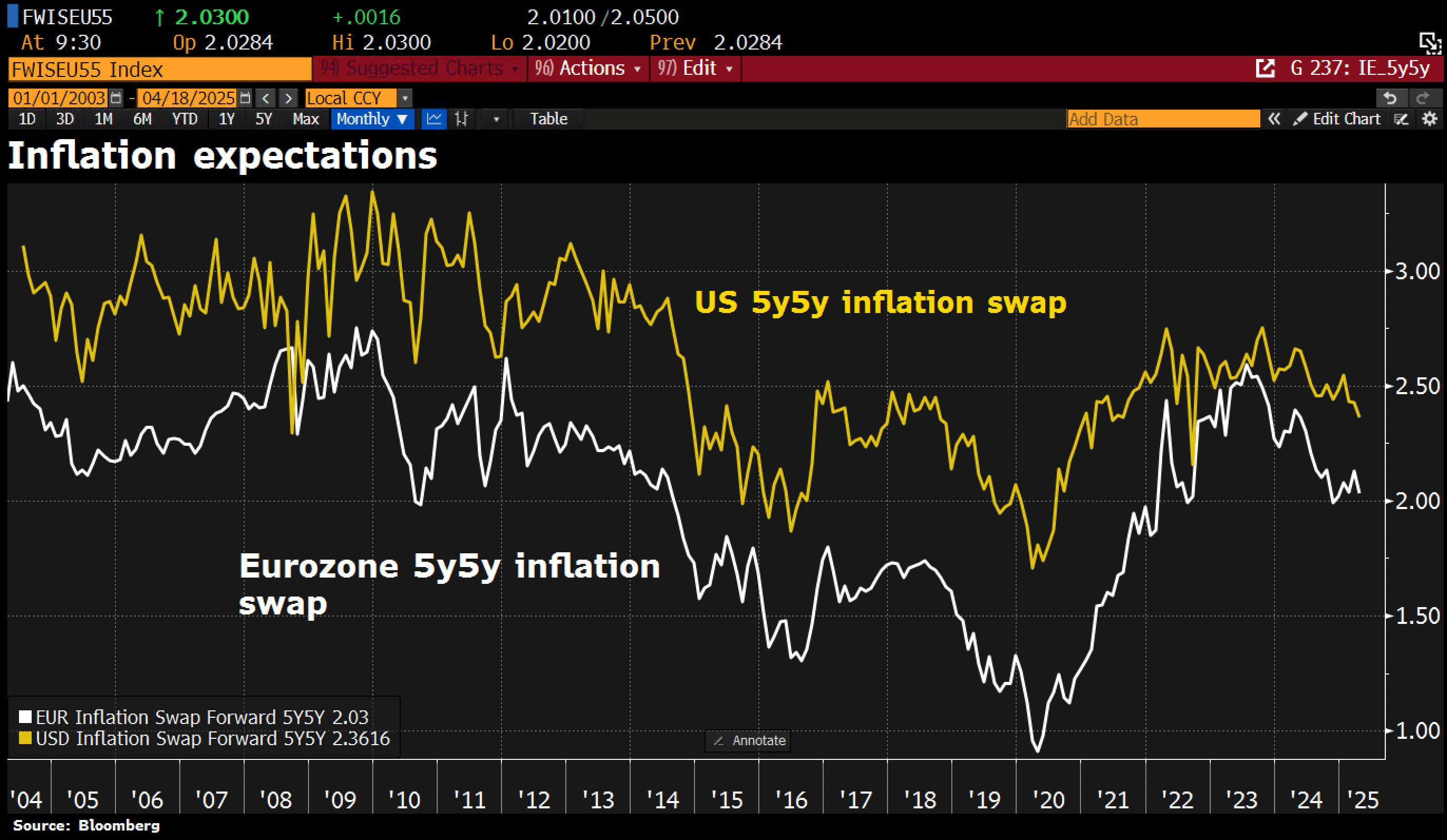 Despite all the talk about tariffs, long-term inflation expectations have stayed stable. If you’re a regular reader of MMH, you’d know that I’ve been calling the lack of damaging inflationary pressure tariffs will have. That’s because even after all of the front-running, we haven’t seen any meaningful rise in inflation, coupled with the devaluation of the USD and the fall out of bed of oil (which Trump made so clear that he wanted to do). The 5y5y inflation expectations are currently at 2.03% for Europe and 2.36% for the US.