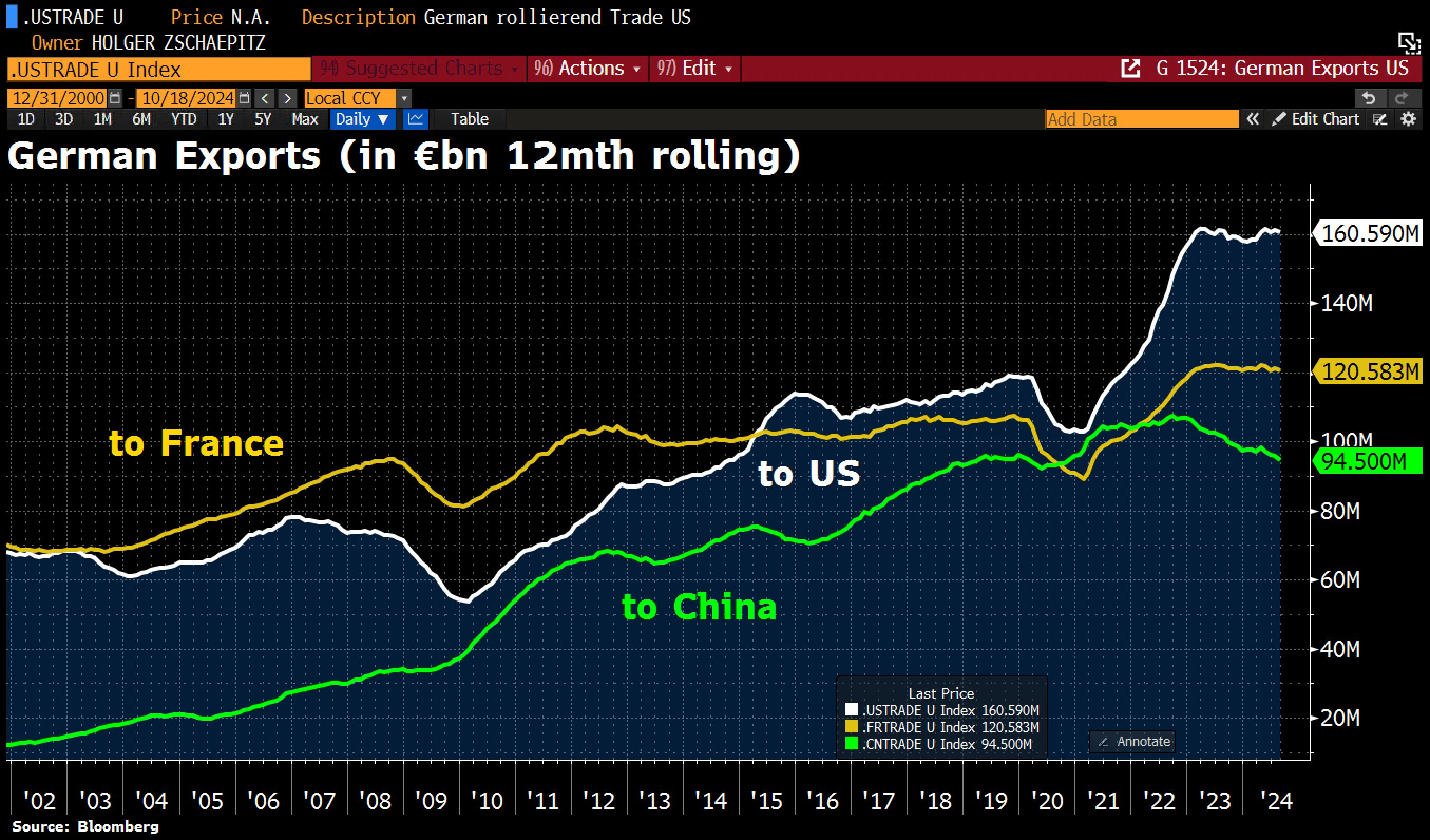 Both France and the U.S. are facing fiscal shifts, which brings some risk to Germany. France’s fiscal issues are deeper and more alarming than the U.S., however, I won’t ignore the fact that if Trump is elected, we may see some extreme tariffs on Europe which will hurt Germany’s export market.