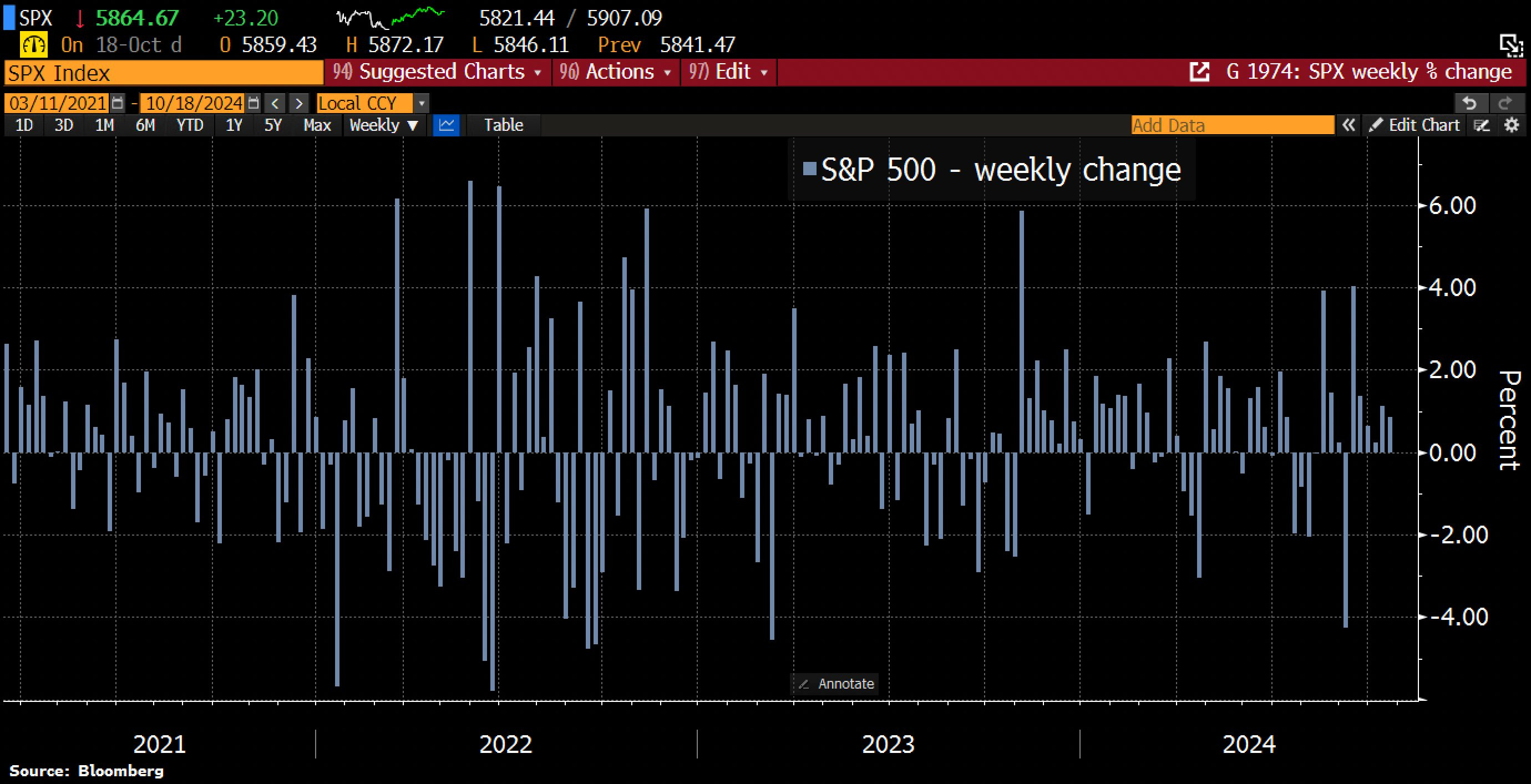 S&P 500 bulls extend the longest weekly winning streak of 2024. On the 37th anniversary of the "Black Monday" market crash, the S&P 500 has risen for the sixth consecutive week. No surprise as the U.S. consumer begins to become more optimistic about fiscal and economic future conditions, helped partially by a new presidential cycle and also strong data amid such high rates.