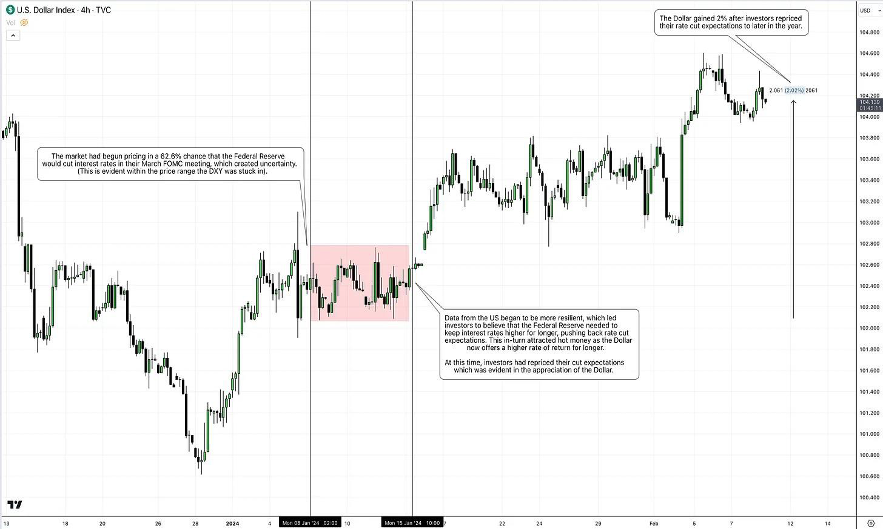 A recent example illustrating the impact of monetary policy expectations on currencies occurred with the US dollar around January 8th, 2024. According to the CME FedWatch tool, market participants then assigned a 62.6% probability to a 25-basis-point interest rate cut by the Federal Reserve to 5.25%. This prospect initially induced some uncertainty in the dollar, reflected by its lack of appreciation during that period.