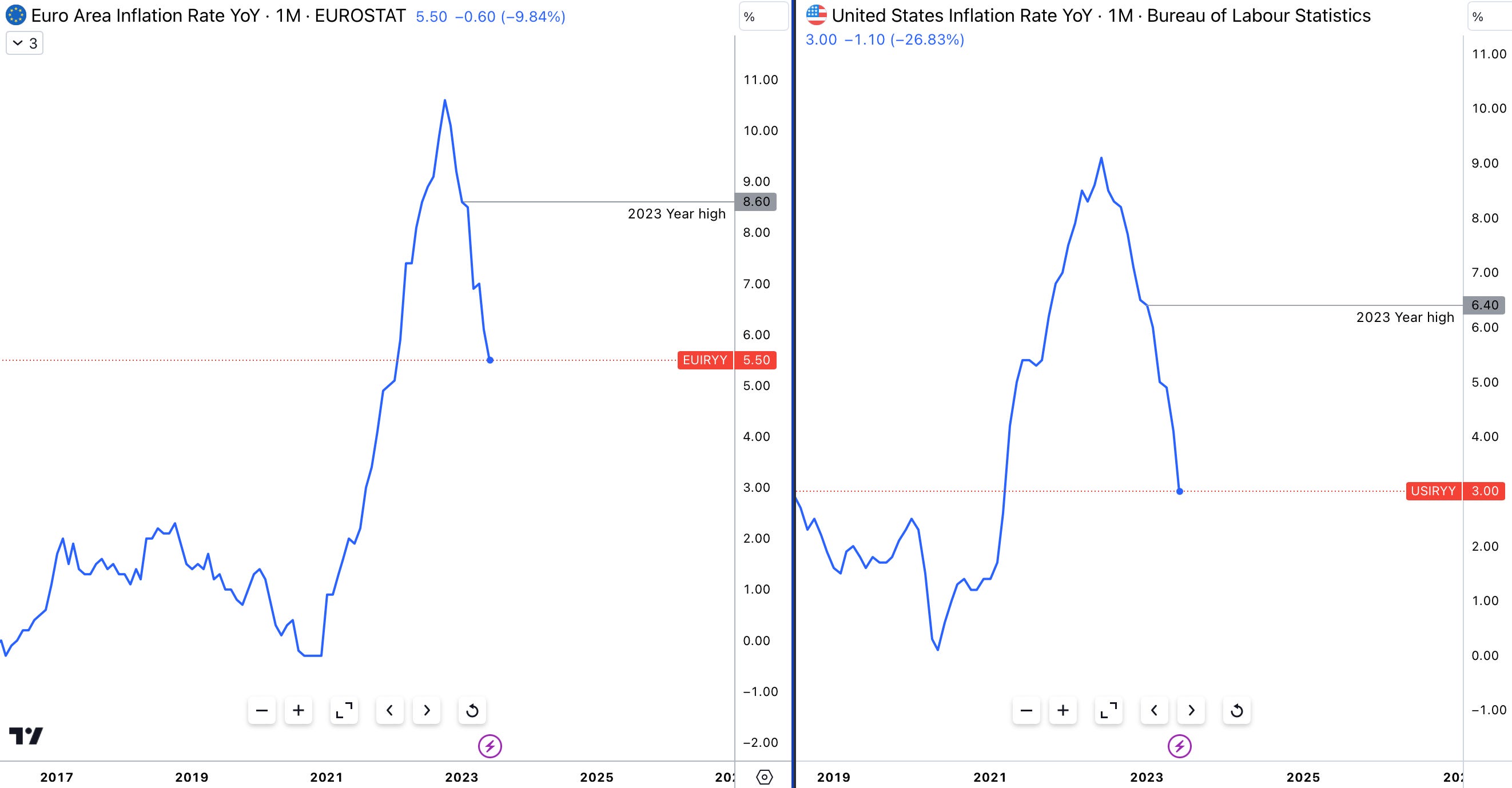 Within the U.S inflation has come down from the highs of 6.1% to now 3.0%, Euro Area CPI is now just 5.50%. Something that will present some FX opportunity later this year, I’ll explain in the second half of this report.