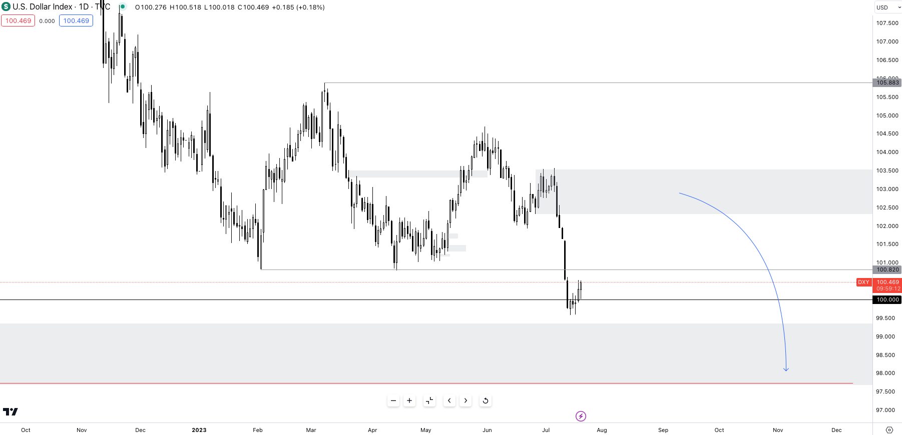 The dollar was and still remains my conviction short play throughout 2023, something that has played out very well since mentioning it. We’ve broken below the 100.00 base value mark so let me explain from a macro positioning why this is a clear short for me.
