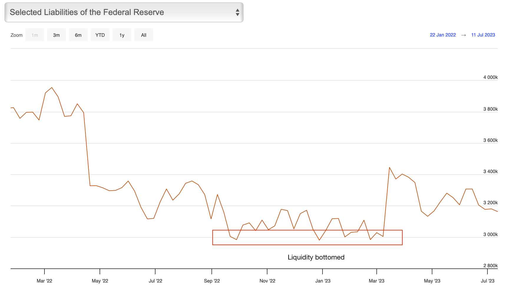 The bottom in Fed liquidity came just after the Gilt market and pension fund crisis in the UK, which raised the worries about a contagion risk in other bond markets around the world. Result? The Fed no longer reduced or tightened financial conditions, primarily liquidity like they promised they would during QT. I call that silent easing.