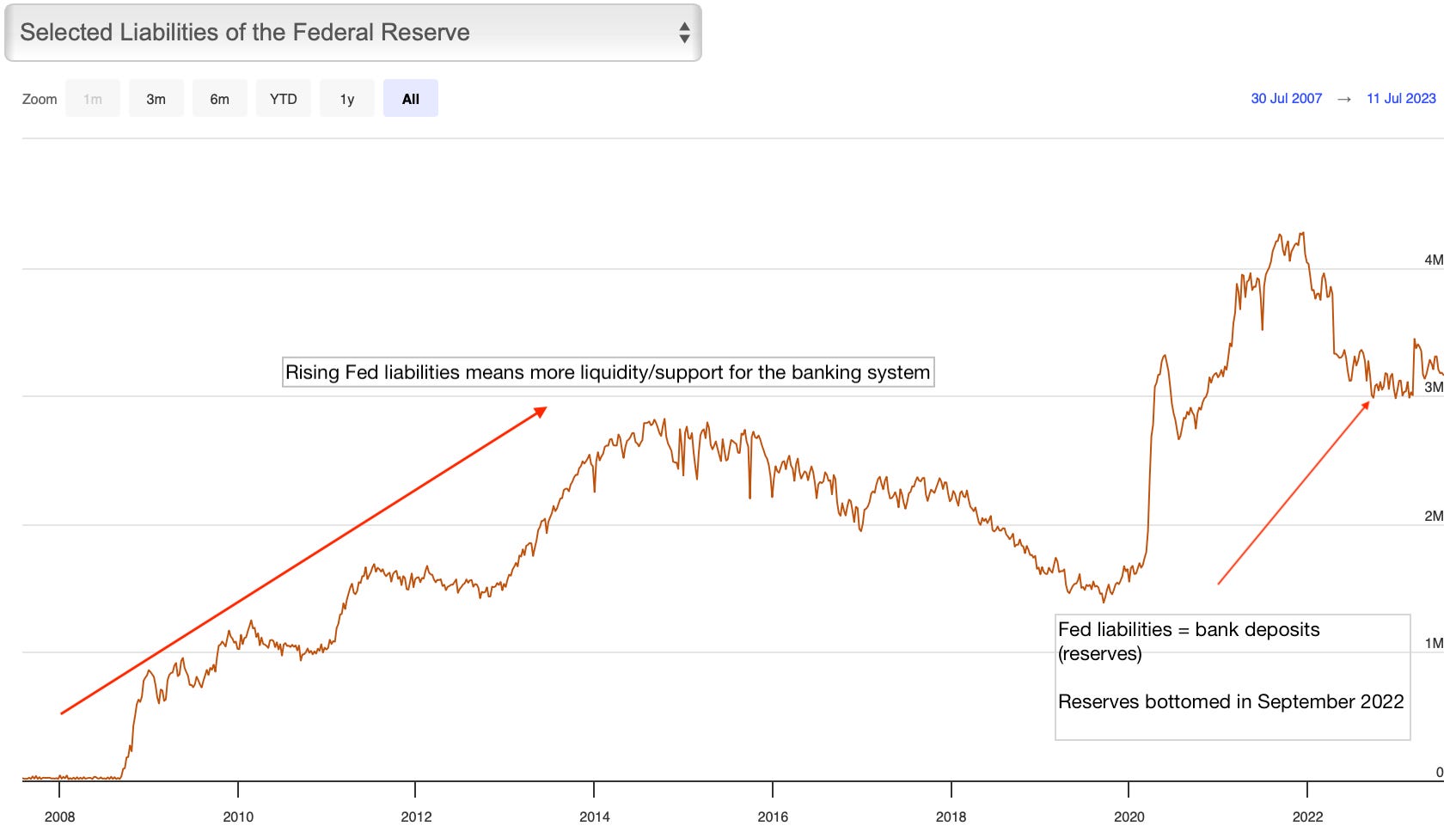 The reason we’re looking at Fed liabilities is because central bank liabilities is mostly compromised of bank deposits and reserves which is a form of liquidity to the financial and banking system. As a reminder, the more reserves within the banking system, the greater the money supply within the economy.