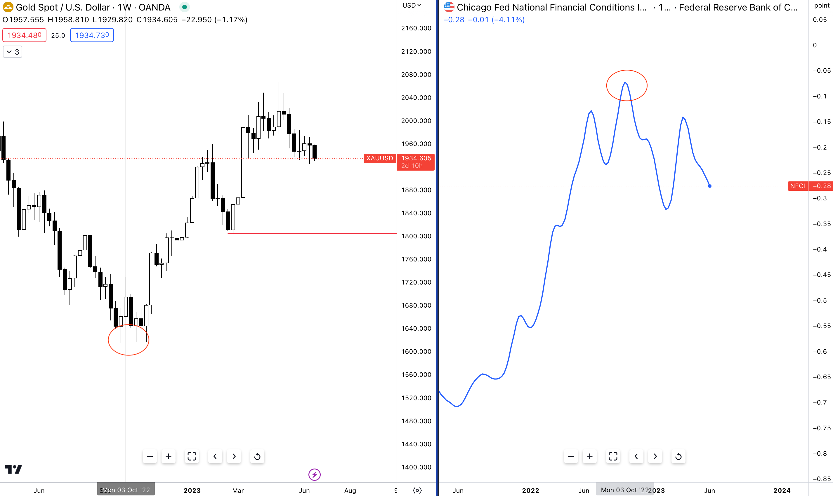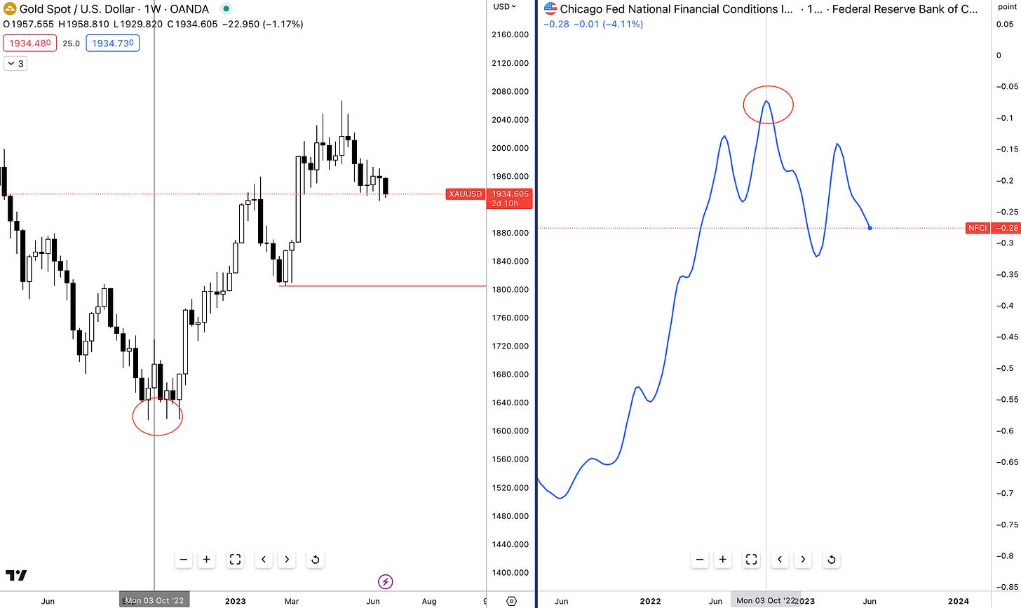 Now, from October 2022 financial conditions were softening even though rates were rising, credit, leverage and risk were becoming more accessible through lenders, practically invalidating the purpose of the Feds’s hikes. So in essence, conditions in the U.S were not getting any tighter, adding to that a record-level central bank purchasing of gold across Q3 and Q4 of 2022. Notably, the PBoC disclosed that it had been buying gold in November 2022, adding 120t in gold reserves.
