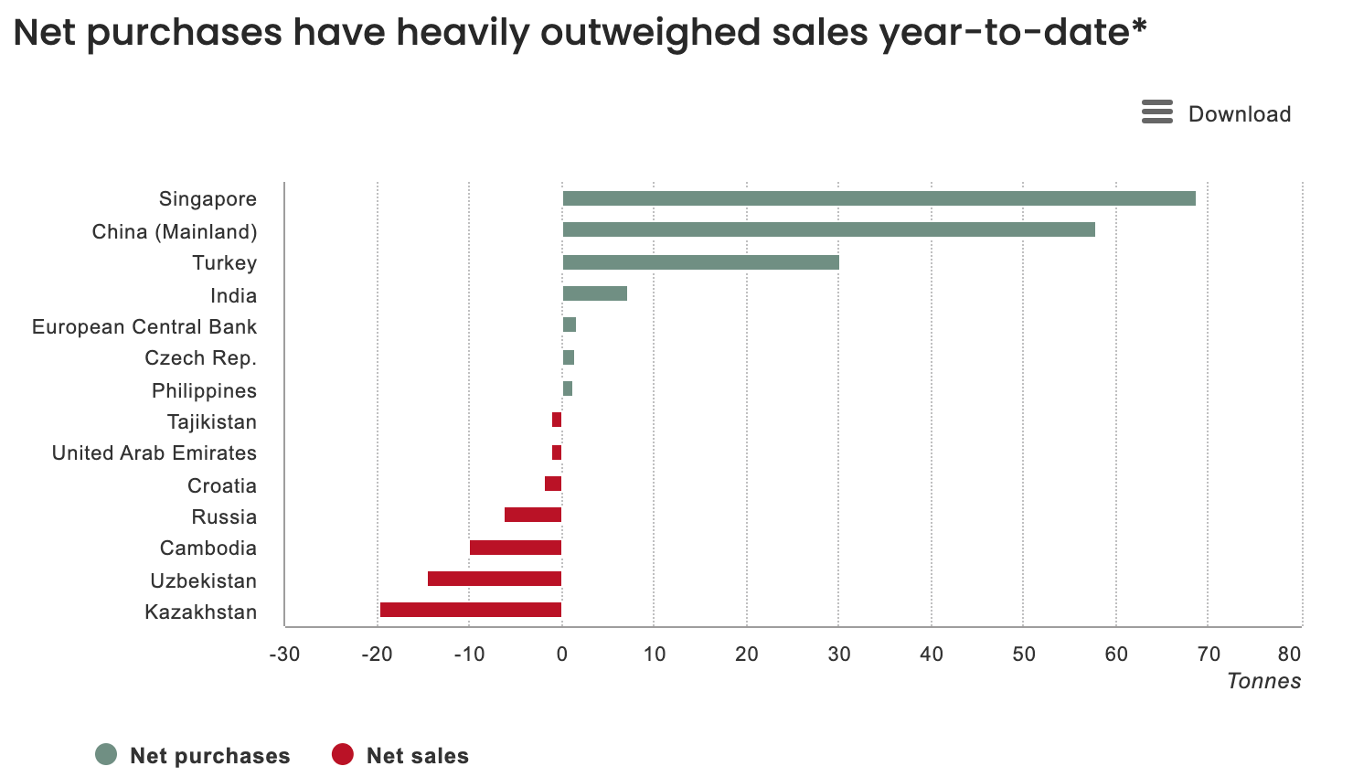 Further central bank gold sales. Thus far this year, central banks have been net purchasers of gold, a trend which stretches back to 2010 when central banks commenced gold buying making them net buyers. However, as you can see, there are always a few central banks that may sell their gold, reasons can vary from raising money to finance government spending and strengthening balance reserves to meeting market demand. A pure example would be Turkey, the central bank in Turkey sold over 81 tonnes of gold this year to meet local demand from its citizens seeking to protect themselves from inflation.