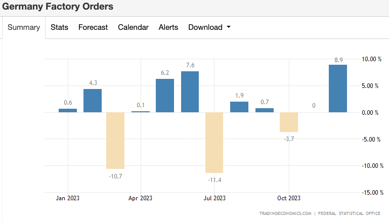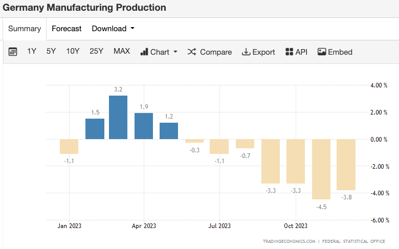 Now don’t be deceived, although the December ‘23 factory orders report showed a large unexpected 8.9% gain, this doesn’t represent a bounceback within the German industrial sector. This large increase was a result of unusually large big-ticket orders for aircraft. For the whole year of 2023, incoming orders fell 5.9% sharing a similar story to that of China’s exports.